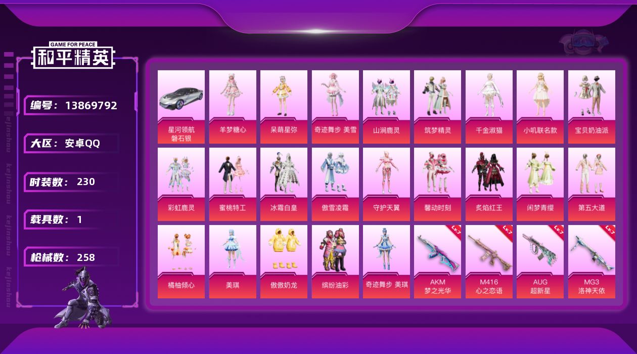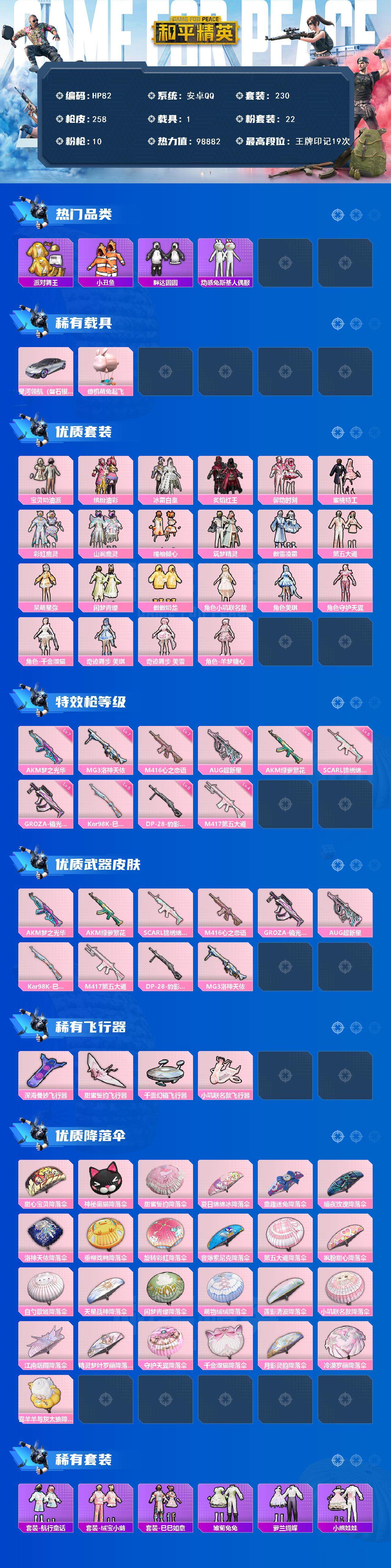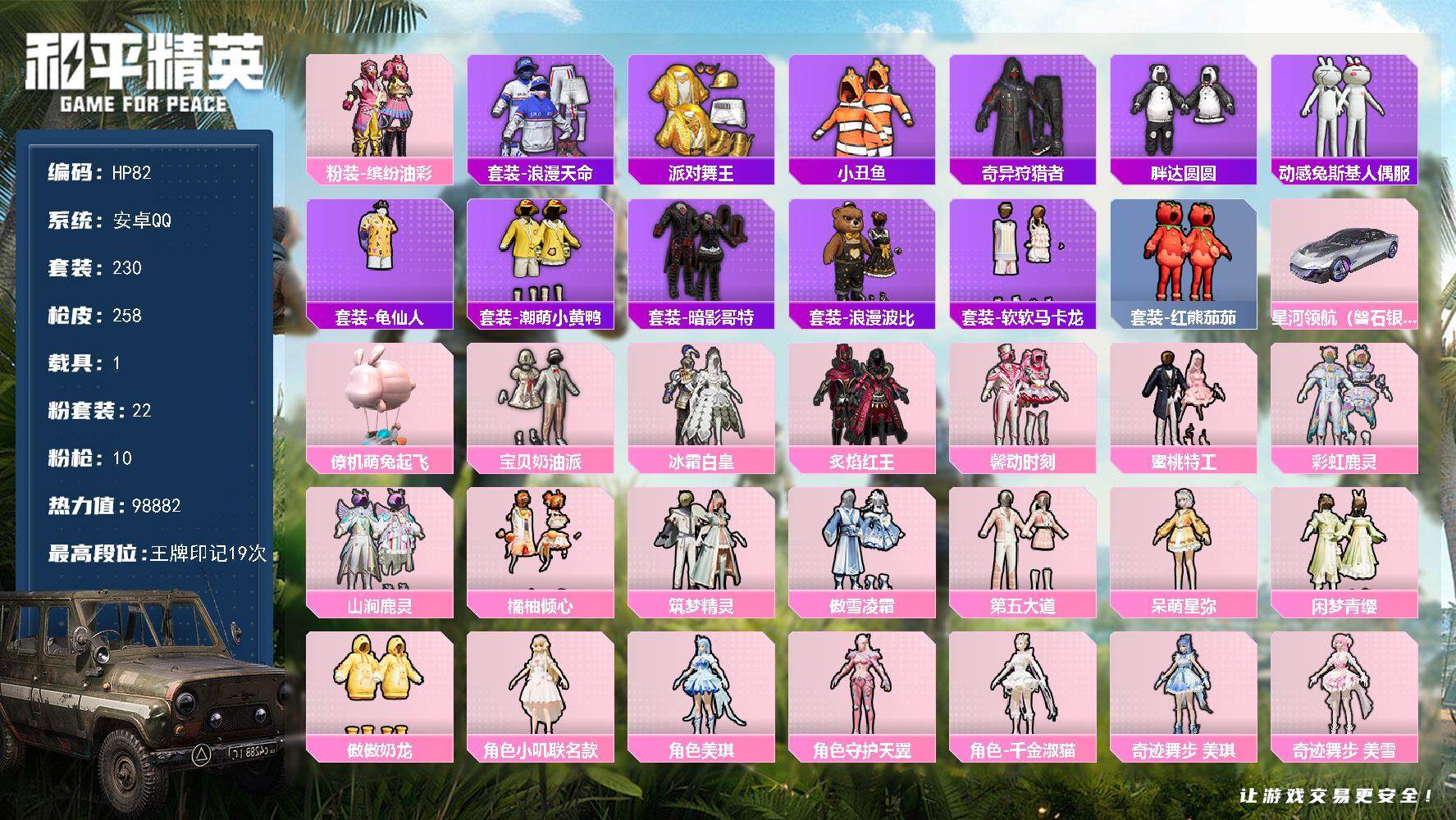 [13869792]安卓 手Q-22粉装-10特效枪-1载具-4粉色飞行器-98882热力值-19王牌印记-230套装-258枪皮