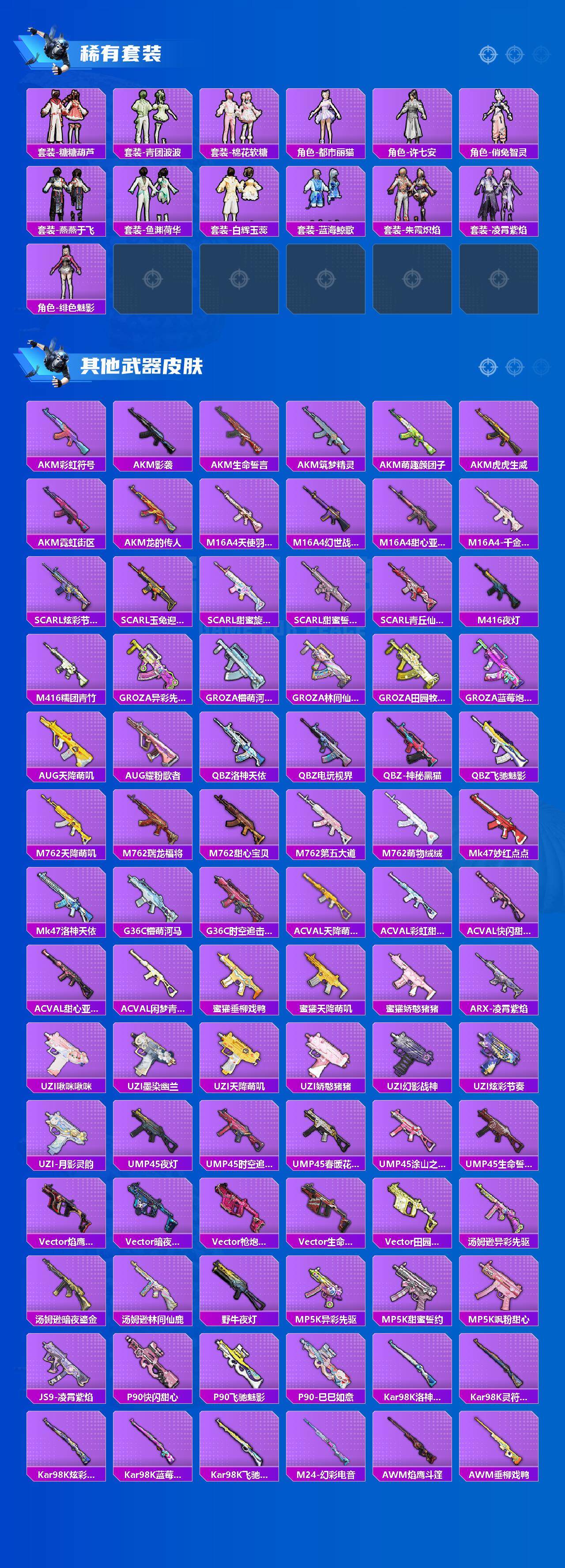 【粉色枪皮】:AKM-梦之光华,AKM-绿萝繁花,SCAR-L-锦绣绵绵,M416-心之恋语,GROZA-镜光银凌,AUG-超新星,Kar98K-巳巳如意,M417-第五大道,DP-28-豹影疾电,MG3-洛神天依