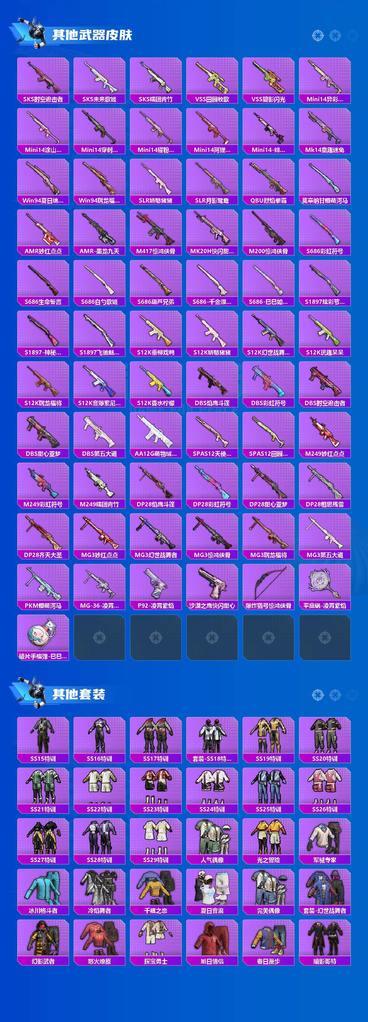 - [12134081]可二次 可修改实名 V6 3王者武器 173英雄武器 2英雄角色 286万化 枪皇SS 武器:王者之影,M4A1-星象,AK47-奉先,MR1-龙吟惊沧海,TAC-晴舞,MK47-云舞,王者之隐,COP 357-堕天神,M4A1-黑龙,M4A1-死神,M4A1-黑骑士,AK47-木兰,M4A1-雷神,AK47-风神翼龙,AK47-黑武士觉醒,AK47-机械迷城,AK47-无影,巴雷特-毁灭,巴雷特-极光,98K-黑骑士,MK47-机械纪元,AWM-天使,QBZ03-金色蔷薇,QBZ03-死神,AUG-机械纪元,M12S-雷霆,双持斯泰尔-天使,MK5-机械纪元,M4A1-运输船,M4A1-夏清觉醒,AK47-黑鲨,AK47-血武士,AK47-春雅,AK47-猩红传说,AK47-沙漠郡主-超觉,AK47-幸运日觉醒,AK47-樱斗士-一觉,M200-心动次元觉醒,09式狙-天神,SCAR-幽暗骑士,AN94-四凶觉醒,SCAR-幽暗骑士觉醒,SCAR-探星者,AN94-超新星,AWM-裁决,AK12-天启,M14EBR-天神,9A91-天神,RPK-赤炎盘龙,SCAR-印刷术,AK47-破空冰刃,CBJ-MS-毒蜂,地狱火,QCW05-变形金刚·大黄蜂,CZS2-血月,CZS2-心动次元,地狱烈炎,PP19野牛-造纸术,MK47-鼓龙,G3A3-五色琉璃觉醒,QBZ03-玉面羞花,M14EBR-拂影,AN94-赳赳秦师,M4A1-太白诗仙,虎贲钩镰刀,墨刃-幻神,雌雄双股剑,沙鹰-修罗,沙鹰-宇航兔兔,改装GLOCK-木兰,沙鹰-超新星,气手枪-血月,沙鹰-神兵修罗,双持柯尔特-极光,M16-恶魔,尼泊尔-雷霆,手斧-机械迷城,麒麟刺-堕天神,尼泊尔-冰锋觉醒,擎天觉醒,QBB95-再战涿鹿,蝴蝶刀-极光,蟒蛇-火力竞放,麒麟刺,秋逸,血阳,屠龙,星芒,龙鳞-觉醒,迷你玉凝,丛林匕首-火力竞放,丛林匕首-庆龙觉醒,斩魔刀,神罚战斧,龙啸,太白诗仙扇,蝴蝶刀-天神,黑骑士手雷,黑武士手雷,幻兽手雷,燃烧弹-游骑兵,手雷-竞界荣光,SCAR-心动PICK,AN94-盖,双持沙鹰-元让,左轮-卧龙觉醒,甩棍-卧龙觉醒,CZS2-仲康,QBZ97-浩瀚征途,XM8-湮灭,M14EBR-葫芦山庄,FAMAS-湮灭,MAC-10-孟获,烈焰弓,蛮神巨斧,AWM-大湾溢彩