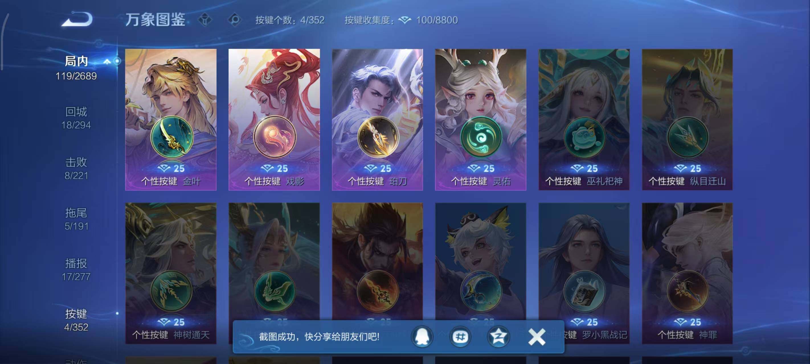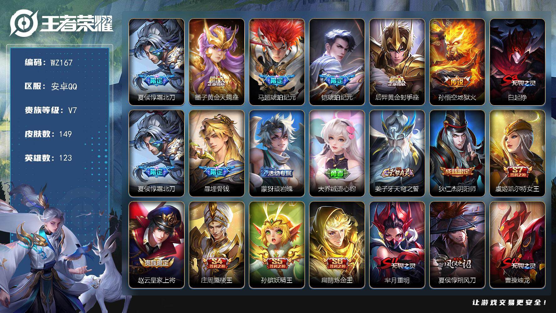 - [12944108]安卓WX-V5-最强王者段位-123英雄-249皮肤-1典藏-0珍品无双-0无双-0珍品传说-6传说-56史诗 【荣耀典藏】:孙悟空全息碎影 【传说皮肤】:云缨幻光神枪,桑启鸣野蒿,鲁班七号寅虎瑞焰,李信一念神魔,达摩黄金狮子座,孙悟空地狱火 【限定皮肤】:白起狰,姜子牙天穹之誓,狄仁杰阴阳师,虞姬凯尔特女王,赵云皇家上将,嬴政白昼王子,鲁班七号狮舞东方,鲁班七号寅虎瑞焰,庄周高山流水,高渐离玩趣恶龙,孙膑妖精王,扁鹊炼金王,白起夜都怪侠,芈月重明,吕布猎兽之王,周瑜赤莲之焰,元歌云间偶戏,夏侯惇朔风刀,曹操烛龙,典韦穷奇,狄仁杰魔术师,狄仁杰万华元夜,达摩星际陆战队,达摩沙漠行僧,项羽海滩派对,老夫子醍醐杖,程咬金演武夺筹,兰陵王驯魔猎人,兰陵王金庭之子,亚瑟潮玩骑士王,牛魔御旌,后羿圣弓游侠,李元芳银河之约,李元芳云中旅人,钟馗神迹守卫,钟馗驱傩正仪,杨玉环遇见飞天,干将莫邪胡桃夹子,干将莫邪真爱魔法,雅典娜黎明之约,蔡文姬繁星吟游,太乙真人饕餮,鬼谷子原初探秘者,鬼谷子五谷丰年,苏烈千军破阵,百里玄策原初追逐者,弈星混沌棋,梦奇顽趣,沈梦溪星空之诺,沈梦溪大漠名商,明世隐疑决卦,明世隐吟游魔法,裴擒虎李小龙,裴擒虎擒涛扼浪,狂铁御狮,米莱狄御霄,米莱狄胡桃异想国,盾山御銮,猪八戒猪悟能,鲁班大师探海日志,桑启海盐诗旅,阿古朵江河有灵,张良古海寻踪,蒙恬荣光圣徽,鬼谷子天穹祈灯,沈梦溪龙舞盛年,刘邦剑破天穹,程咬金群星魔术团,周瑜熔金海岸 【年限皮肤】:鲁班七号寅虎瑞焰 【赛季限定】:孙膑妖精王,扁鹊炼金王,白起狰,芈月重明,夏侯惇朔风刀,曹操烛龙,典韦穷奇,狄仁杰万华元夜,达摩沙漠行僧,老夫子醍醐杖,程咬金演武夺筹,兰陵王金庭之子,张良古海寻踪,牛魔御旌,李元芳云中旅人,虞姬凯尔特女王,钟馗驱傩正仪,雅典娜黎明之约,太乙真人饕餮,鬼谷子原初探秘者,苏烈千军破阵,百里玄策原初追逐者,弈星混沌棋,梦奇顽趣,沈梦溪大漠名商,明世隐疑决卦,裴擒虎擒涛扼浪,狂铁御狮,米莱狄御霄,盾山御銮,鲁班大师探海日志,桑启海盐诗旅,鬼谷子天穹祈灯,蒙恬荣光圣徽,刘邦剑破天穹,姜子牙天穹之誓 【战令限定】:嬴政白昼王子,鲁班七号狮舞东方,白起夜都怪侠,吕布猎兽之王,周瑜赤莲之焰,元歌云间偶戏,达摩星际陆战队,兰陵王驯魔猎人,亚瑟潮玩骑士王,后羿圣弓游侠,李元芳银河之约,钟馗神迹守卫