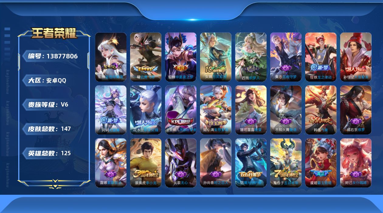 - [11517791]V9 1典藏 1珍品传说 19传说 126英雄 357皮肤 典藏英雄武则天 可修改实名 荣耀水晶:全息碎影(猴子典藏) 珍品传说:怪盗基德 传说皮:幻光神枪,黄金射手座,零号·赤焰,地狱火,仲夏夜之梦(大飞蛾),海洋之心,末日机甲-孙尚香(绿蚂蚱),云霓雀翎,久胜战神,炽阳神光,超时空战士-狄仁杰,浮生妄,霜月吟,澜逐花归海 珍宝阁皮:万物之道,优雅恋人,女武神 限定皮:愿照·九州拓(澜年限),鸣野蒿,至尊宝,凤求凰(白切鸡),傲雪梅枪,白晶晶,时雨天司(水龙头),飞衡(韩信年限),高山流水,五谷丰年,冰锋战神,梁祝,御风骁将(吕布年限),李小龙,逐梦之影,朱雀志(守约年限),辉光之辰,如梦令-后羿,霸王别姬-虞姬,默契交锋-花木兰,孙行者,大圣娶亲 史诗皮:星界战将,茶境仙,器灵·浮梦炉,化蝶舞,怒海争锋,破空之剑,紫霞仙子,苍穹之光,电玩小子(小书包),白龙吟,黄金分割率,特工魅影,千年之狐,电玩·爆裂旋风,鹤归松栖(赵怀真),冰冠公主,百解令(蒙犽),高渐离燃音魔法,蒙恬荣光圣徽,偶像歌手,青蛇,暗夜猫娘,魅语,龙骑士(小龙虾),末日机甲-吕布,猫狗日记-孙策,猫狗日记-大乔,乱世虎臣,节奏热浪,修罗,女仆咖啡,摇滚巨星,水果甜心,绅士熊喵,天才门将,星夜王子,心灵骇客,功夫厨神,德古拉伯爵,暗隐猎兽者,幽灵船长,鬼剑武藏,暗渊魔法,心灵战警,乐园奇幻夜,地狱岩魂,纤云弄巧,繁星吟游(呼啦呼啦),拒霜思,缤纷独角兽,乘风破浪,逐浪之夏,月团寄思,水晶猎龙者,曙光守护者,箭羽风息,金属风暴,原初追逐者,圣诞狂欢,圣诞恋歌,鹰眼统帅,暗夜贵公子,魅力维加斯,黎明之约,无心,未来纪元-赵云
