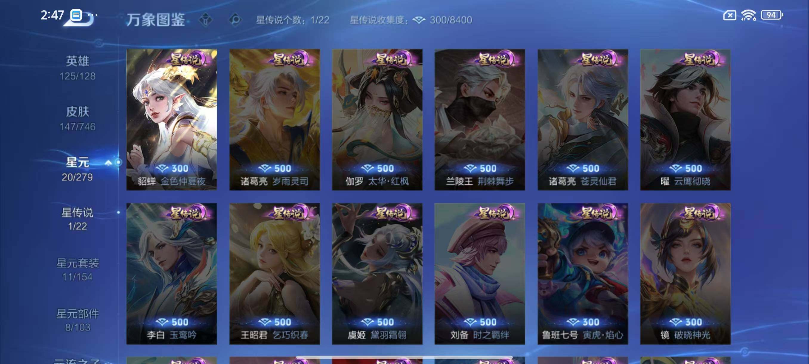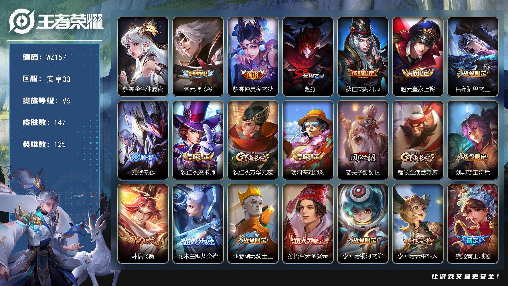 [13877806]安卓Q-V6-147皮肤-2传说-46史诗 【传说皮肤】:曜云鹰飞将,貂蝉仲夏夜之梦 【限定皮肤】:白起狰,狄仁杰阴阳师,赵云皇家上将,吕布猎兽之王,元歌无心,狄仁杰魔术师,狄仁杰万华元夜,项羽海滩派对,老夫子醍醐杖,程咬金演武夺筹,刘邦夺宝奇兵,韩信飞衡,花木兰默契交锋,亚瑟潮玩骑士王,孙悟空大圣娶亲,李元芳银河之约,李元芳云中旅人,虞姬霸王别姬,钟馗驱傩正仪,蔡文姬繁星吟游,鬼谷子原初探秘者,鬼谷子五谷丰年,弈星混沌棋,沈梦溪星空之诺,明世隐疑决卦,裴擒虎李小龙,云中君纤云弄巧,猪八戒西部大镖客,上官婉儿天狼绘梦者,姬小满妄想食味 【年限皮肤】:韩信飞衡 【赛季限定】:白起狰,狄仁杰万华元夜,老夫子醍醐杖,程咬金演武夺筹,李元芳云中旅人,钟馗驱傩正仪,鬼谷子原初探秘者,弈星混沌棋,明世隐疑决卦 【战令限定】:吕布猎兽之王,刘邦夺宝奇兵,亚瑟潮玩骑士王,李元芳银河之约,沈梦溪星空之诺,猪八戒西部大镖客 【史诗皮肤】:露娜紫霞仙子,赵云皇家上将,貂蝉圣诞恋歌,狄仁杰魔术师,宫本武藏鬼剑武藏,孙尚香水果甜心,嬴政摇滚巨星,妲己魅力维加斯,妲己女仆咖啡,曹操幽灵船长,李白千年之狐,虞姬霸王别姬,夏侯惇乘风破浪,兰陵王暗隐猎兽者,诸葛亮黄金分割率,雅典娜冰冠公主,安琪拉心灵骇客,百里守约特工魅影,铠曙光守护者,程咬金功夫厨神,白起星夜王子,阿轲节奏热浪,孙策猫狗日记,孙悟空大圣娶亲,伽罗箭羽风息,狄仁杰鹰眼统帅,蔡文姬繁星吟游,李元芳银河之约,娜可露露晚萤,韩信飞衡,不知火舞魅语,橘右京修罗,孙尚香时之恋人,上官婉儿天狼绘梦者,裴擒虎李小龙,云中君纤云弄巧,花木兰默契交锋,张良千筹问战,鬼谷子五谷丰年,元歌无心,姬小满妄想食味,阿轲化蝶舞,狂铁龙之律动,黄忠百相守梦,西施织梦人,女娲万灵启世 【其他皮肤】:项羽海滩派对,韩信教廷特使,韩信街头霸王,露娜哥特玫瑰,达摩大发明家,芈月红桃皇后,白起白色死神,牛魔西部大镖客,宫本武藏未来纪元,孙膑天使之翼,妲己少女阿狸,典韦黄金武士,亚瑟死亡骑士,达摩拳王,花木兰兔女郎,甄姬花好人间,刘备万事如意,后羿阿尔法小队,狄仁杰阴阳师,关羽龙腾万里,白起狰,钟无艳海滩丽影,宫本武藏霸王丸,狂铁命运角斗场,老夫子功夫老勺,孙尚香沉稳之力,安琪拉如懿,苏烈坚韧之力,大乔守护之力,吕布猎兽之王,小乔丁香结,沈梦溪鲨炮海盗猫,沈梦溪星空之诺,