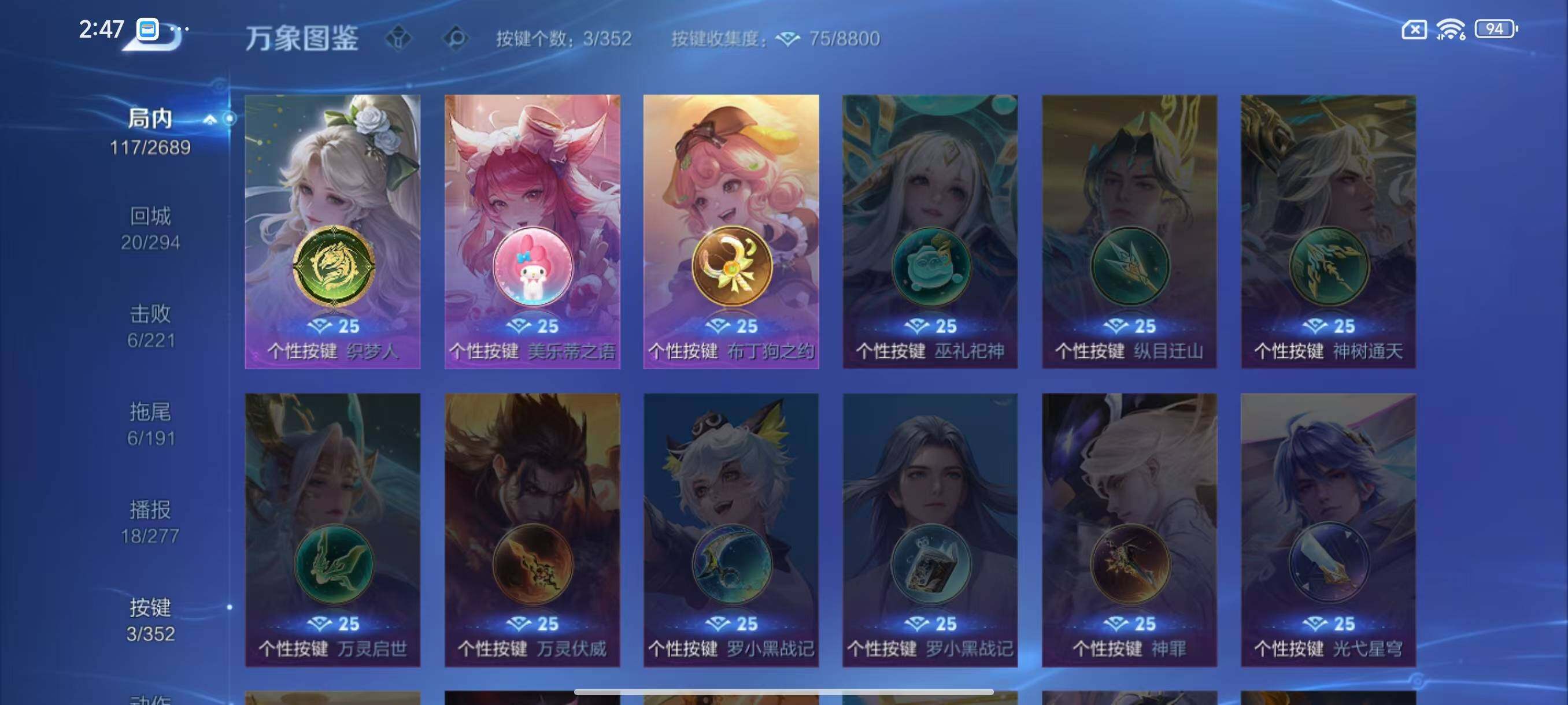 - [11227573]V7 1典藏 1传说 123英雄 312皮肤 可修改实名 荣耀水晶:全息碎影(猴子典藏) 珍宝阁皮:妄想食味,优雅恋人,蔷薇恋人 限定皮:逐霄战戟,鸣野蒿,傲雪梅枪,遇见飞天,五谷丰年,游园惊梦,梁祝,天狼溯光者,天狼绘梦者,李小龙,孙行者,山海·玄木吟(马可年限) 史诗皮:龙之律动,紫霞仙子,白龙吟,黄金分割率,特工魅影,千年之狐,江河有灵,百解令(蒙犽),冰冠公主,偶像歌手,无限星赏官,电玩·爆裂旋风,末日机甲-吕布,猫狗日记-孙策,时之恋人-孙尚香,乱世虎臣,节奏热浪,女仆咖啡,摇滚巨星,水果甜心,绅士熊喵,天才门将,星夜王子,心灵骇客,功夫厨神,德古拉伯爵,暗隐猎兽者,幽灵船长,鬼剑武藏,心灵战警,天秀·启明,舞动绿茵,纤云弄巧,繁星吟游(呼啦呼啦),拒霜思,缤纷独角兽,乘风破浪,逐浪之夏,水晶猎龙者,曙光守护者,箭羽风息,唤灵魅影,金属风暴,圣诞狂欢,圣诞恋歌,鹰眼统帅,暗夜贵公子,魅力维加斯,千筹问战,无心,未来纪元-赵云