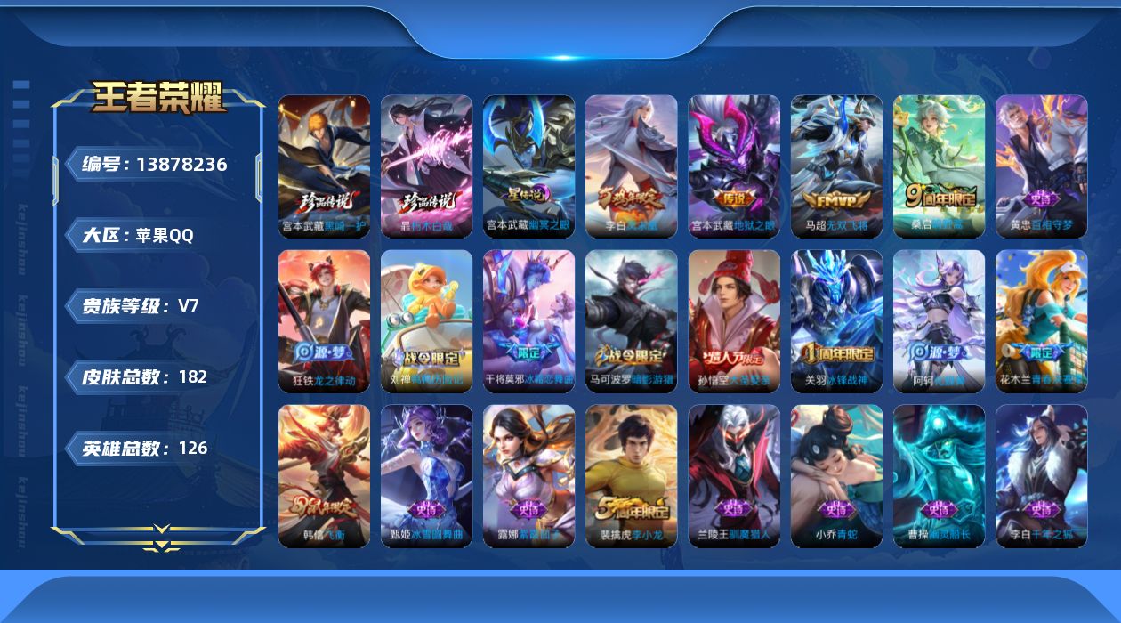 - PX_2107256-实名: 可修改 贵族等级: V8 英雄数: 122 皮肤数: 197 荣耀水晶: 杀手不太冷,全息碎影 星传说: 金色仲夏夜 传说皮: 冠军飞将,云霓雀翎,仲夏夜之梦,零号·赤焰 限定皮: 李小龙,梁祝,武圣,神威,飞衡,太华,天狼征服者,天狼绘梦者,青龙志,大圣娶亲
