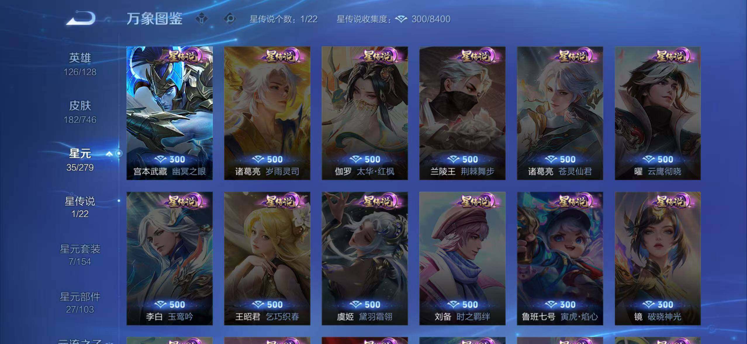 虞姬凯尔特女王,白起狰,太乙真人饕餮,曹操烛龙,芈月重明,典韦穷奇,狂铁御狮,米莱狄御霄,牛魔御旌,盾山御銮,夏侯惇朔风刀,明世隐疑决卦,老夫子醍醐杖,鬼谷子原初探秘者,狄仁杰万华元夜,程咬金演武夺筹,钟馗驱傩正仪,刘邦夺宝奇兵,马可波罗暗影游猎,弈星混沌棋,桑启海盐诗旅,裴擒虎擒涛扼浪,鲁班大师探海日志,张良古海寻踪