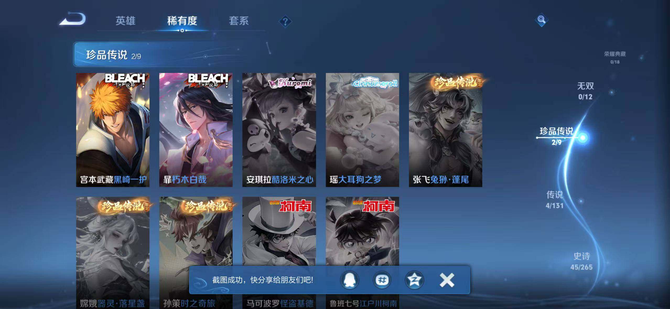 - PX_2094661-60 安卓QQ/永恒钻石/323皮肤/124英雄/0典藏/0珍品无双/2无双/0珍品传说/22传说/86史诗/8稀有英雄 【2 无双皮肤】时之魔女 小乔,器灵·螭龙剑 曜, 【22 传说皮肤】启明星使 虞姬,零号·赤焰 孙悟空,云鹰飞将 曜,惊梅引 宫本武藏,炽阳神光 镜,黄金射手座 后羿,遇见神鼓 吕布,寅虎·瑞焰 鲁班七号,时之恋人 刘备,乘龙·淬吴钩 孙策,山海·炽霜斩