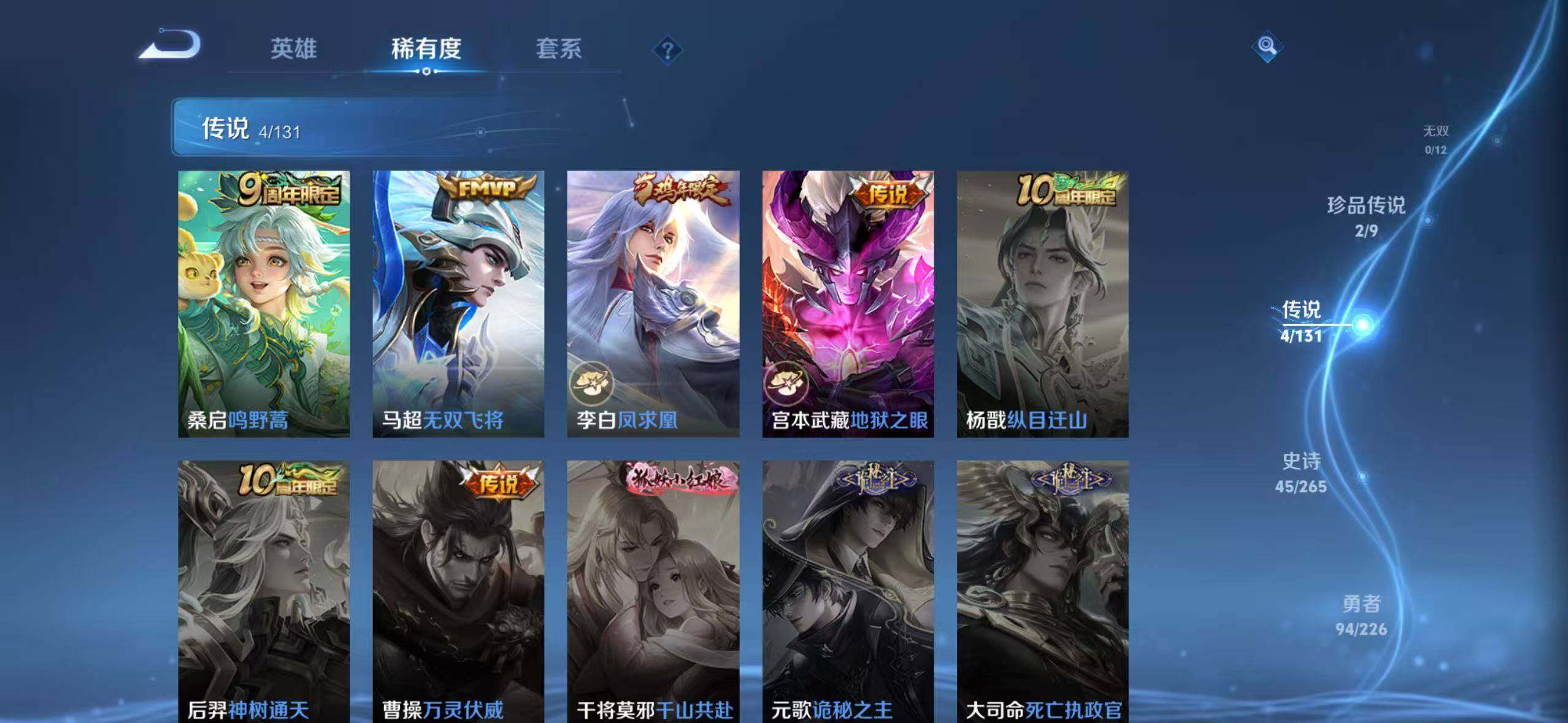 【传说皮肤】:桑启鸣野蒿,马超无双飞将,李白凤求凰,宫本武藏地狱之眼