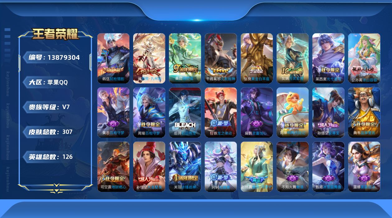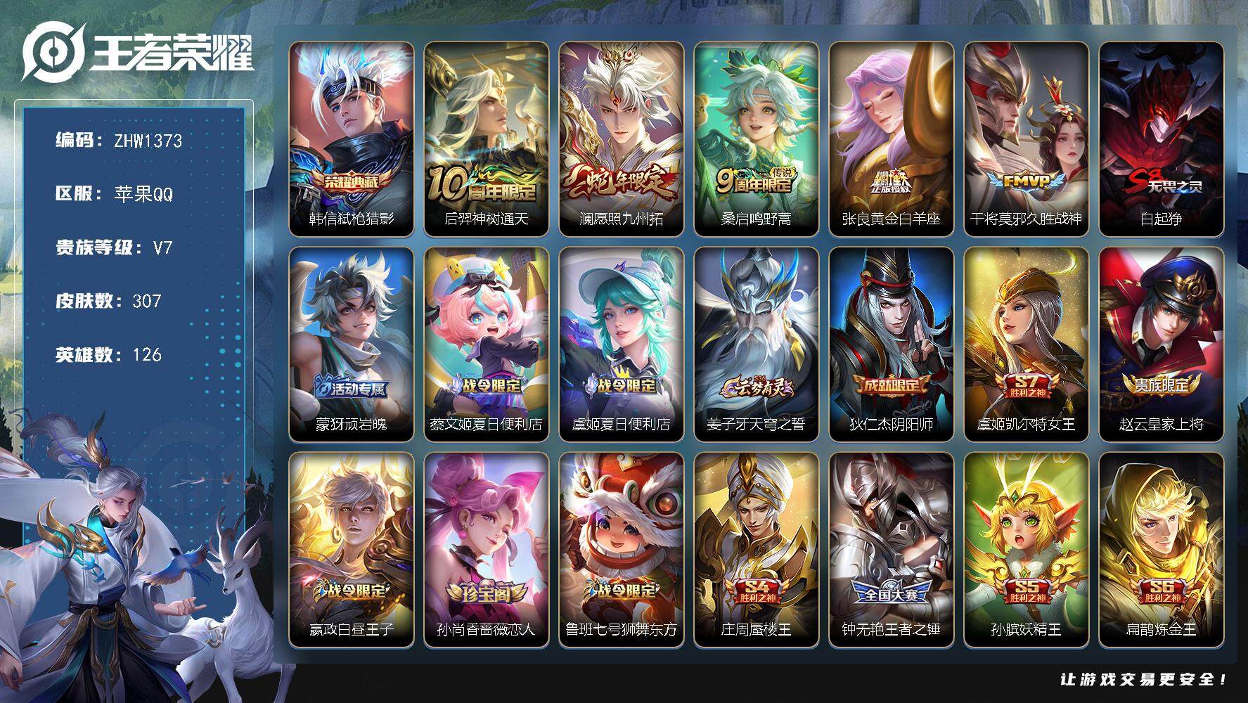 [13879304]可二次【店主推荐捡漏号!可直接换绑/5市标8现标】:苹果Q-V7-最强王者段位-126英雄-307皮肤-1典藏-5传说-80史诗
