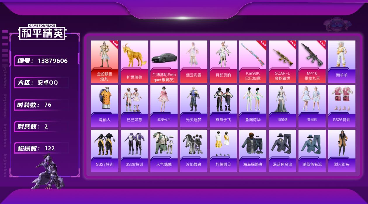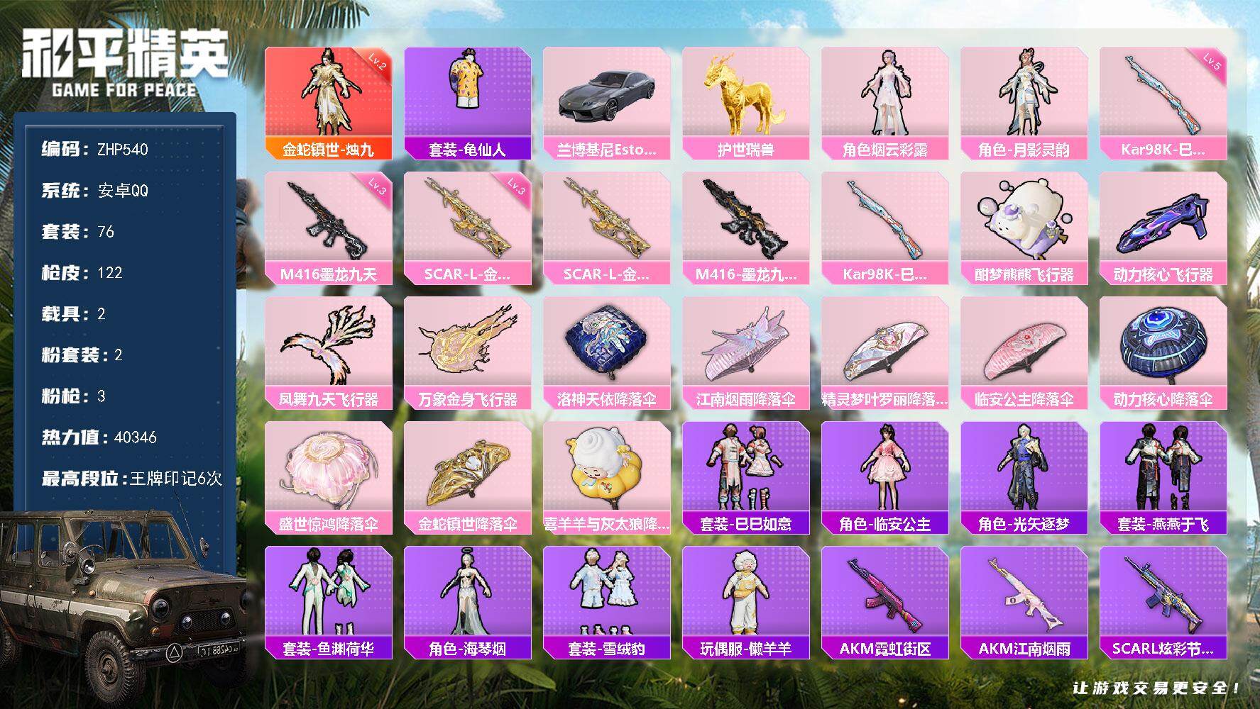 [13879606]可二次【店主推荐捡漏号!可直接换绑】/素材身法号/地铁满天赋 安卓 手Q-1神装-2粉装-3特效枪-2载具-7粉色飞行器-4w热力值-6王牌印记-76套装-122枪皮【红色神装等级】:金蛇镇世-烛九(二级)【热门品类】:套装-龟仙人【粉色载具】:兰博基尼Estoque(银翼灰),护世瑞兽【粉色套装】:角色-烟云彩露,角色-月影灵韵【粉色枪皮等级】:SCAR-L-金蛇镇世(三级),M416-墨龙九天(三级),Kar98K-巳巳如意(五级)【粉色飞行器】:酣梦熊熊飞行器,动力核心飞行器,凤舞九天飞行器,万象金身飞行器