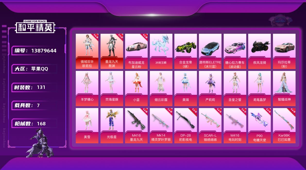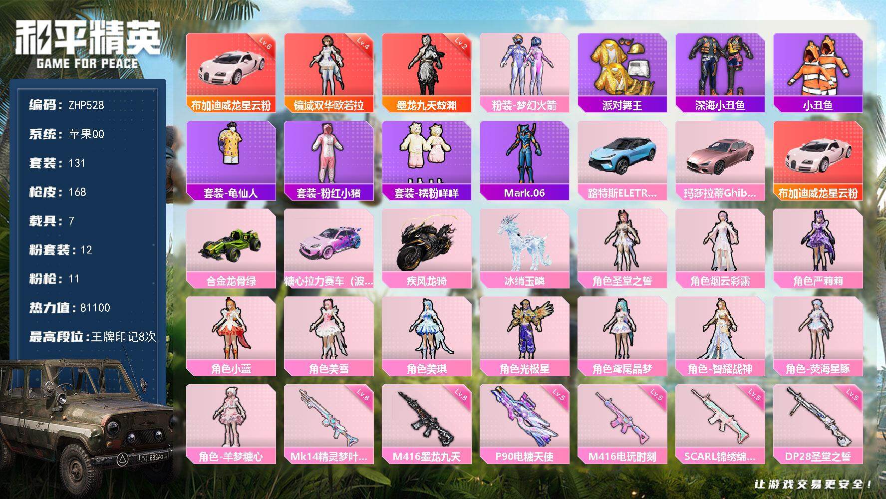 [13879644]【店主推荐捡漏号!可直接换绑】/素材身法号/布加迪威龙(星云粉)(六级)/镜域双华-欧若拉(四级)/绝世印记3 苹果 手Q-2神装-12粉装-11特效枪-7载具-7粉色飞行器-8.1热力值-8王牌印记-131套装-168枪皮【红色载具】:布加迪威龙(星云粉)(六级)【红色神装等级】:墨龙九天-敖渊(二级),镜域双华-欧若拉(四级)【热门品类】:粉装-梦幻火箭,套装-派对舞王,套装-深海小丑鱼,套装-小丑鱼,套装-龟仙人,套装-粉红小猪,套装-糯粉咩咩,角色-Mark.06【粉色载具】:路特斯ELETRE(冰川蓝),玛莎拉蒂Ghibli(粉),布加迪威龙(星云粉),合金龙骨(绿),糖心拉力赛车(波动紫),疾风龙骑,冰绡玉鳞【粉色套装】:粉装-梦幻火箭,角色-圣堂之誓,角色-烟云彩露,角色-严莉莉,角色-小蓝,角色-美雪,角色-美琪,角色-光极星,角色-鸢尾晶梦,角色-智耀战神,角色-荧海星豚,角色-羊梦糖心【粉色枪皮等级】:SCAR-L-锦绣绵绵(五级),M416-电玩时刻(五级),M416-墨龙九天(六级),GROZA-巴啦啦小魔仙(四级),M762-电糖天使(三级),P90-电糖天使(五级),Kar98K-巳巳如意(五级),M24-镜域双华(三级),Mk14-精灵梦叶罗丽(六级),DP-28-圣堂之誓(五级),DP-28-豹影疾电(五级)【粉色飞行器】:镜域双华-灵镜之阶,巴啦啦小魔仙飞行器,龙翔九天飞行器,飞天猪飞行器,灵珠游龙飞行器