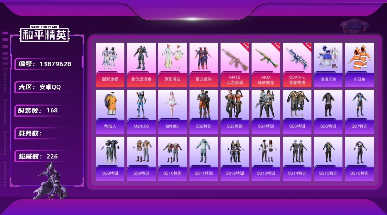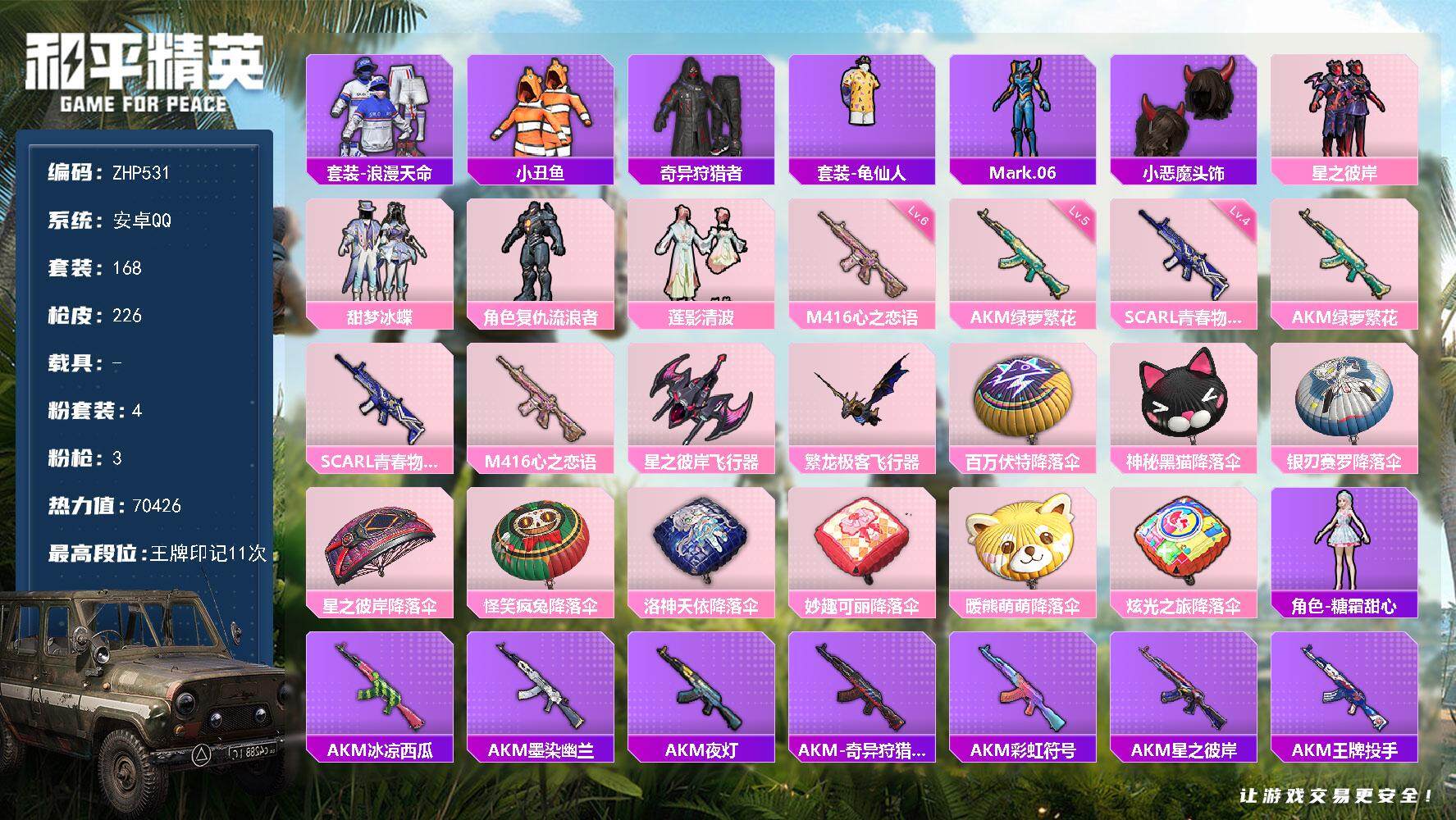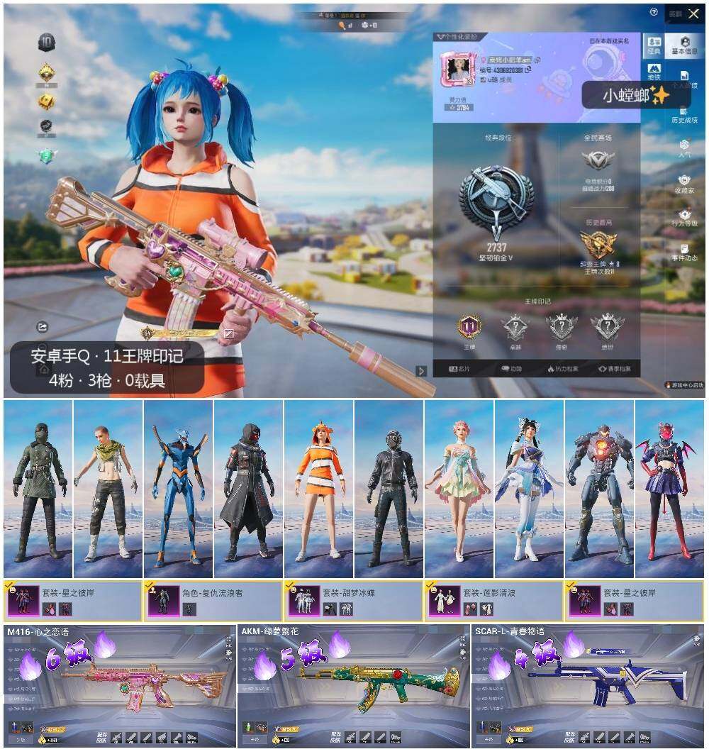 [13879628]【店主推荐捡漏号!可直接换绑】 安卓 手Q-4粉装-3特效枪-2粉色飞行器-7w热力值-11王牌印记-168套装-226枪皮【热门品类】:套装-浪漫天命,套装-小丑鱼,套装-奇异狩猎者,套装-龟仙人,角色-Mark.06,小恶魔头饰【粉色套装】:粉装-星之彼岸,粉装-甜梦冰蝶,角色-复仇流浪者,粉装-莲影清波【粉色枪皮等级】:AKM-绿萝繁花(五级),SCAR-L-青春物语(四级),M416-心之恋语(六级)【粉色飞行器】:星之彼岸飞行器,繁龙极客飞行器