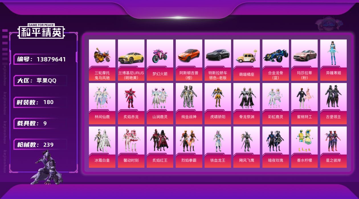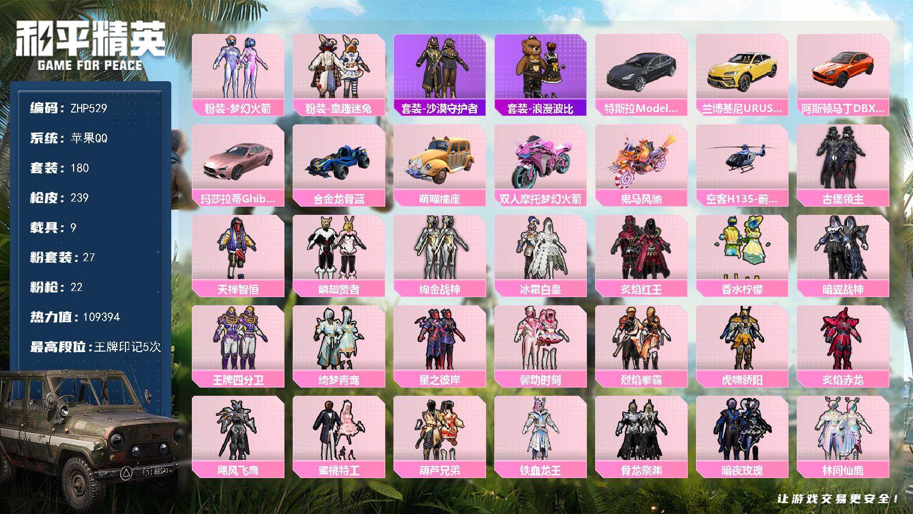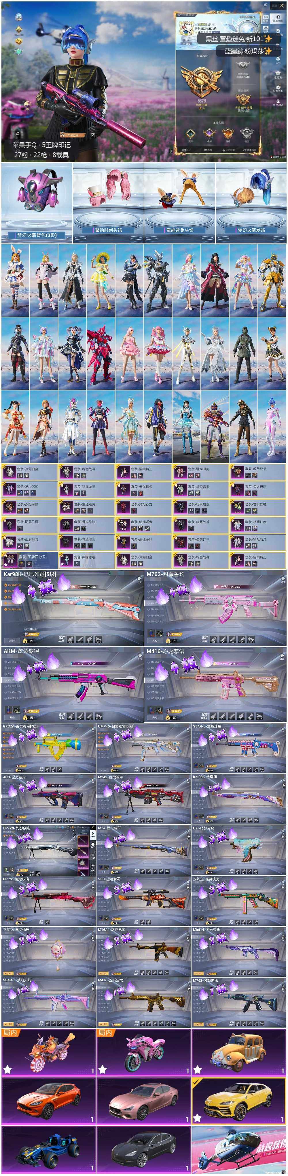 [13879641]【店主推荐捡漏号!可直接换绑】/素材身法号 苹果 手Q-27粉装-22特效枪-9载具-7粉色飞行器-10.9w热力值-5王牌印记-180套装-239枪皮【热门品类】:粉装-梦幻火箭,粉装-童趣迷兔,套装-沙漠守护者,套装-浪漫波比【粉色载具】:特斯拉Model 3(冷光银),兰博基尼URUS(明艳黄),阿斯顿马丁DBX(橙),玛莎拉蒂Ghibli(粉),合金龙骨(蓝),萌喵橘座,双人摩托-梦幻火箭,鬼马风驰,空客H135-蔚蓝之翼【粉色套装】:粉装-梦幻火箭,粉装-古堡领主,粉装-天禅智恒,粉装-鳞翅贤者,粉装-绚金战神,粉装-冰霜白皇,粉装-童趣迷兔,粉装-炙焰红王,粉装-香水柠檬,粉装-暗翼战神,粉装-王牌四分卫,粉装-绮梦青鸾,粉装-星之彼岸,粉装-馨动时刻,粉装-烈焰拳霸,粉装-虎啸骄阳,粉装-炙焰赤龙,粉装-飓风飞鹰,粉装-蜜桃特工,粉装-葫芦兄弟,粉装-铁血龙王,粉装-骨龙祭渊,粉装-暗夜玫瑰,粉装-林间仙鹿,粉装-彩虹鹿灵,粉装-山涧鹿灵,角色-异瞳寒姬【粉色枪皮等级】:AKM-炫紫旋律(四级),M16A4-葫芦兄弟(二级),SCAR-L-梦幻火箭(一级),SCAR-L-童趣迷兔(四级),M416-五爪金龙(一级),M416-心之恋语(四级),GROZA-香水柠檬(四级),AUG-星之彼岸(四级),M762-甜蜜誓约(四级),M762-激战未来(一级),UZI-绮梦青鸾(三级),UMP45-相思残雪(四级),汤姆逊-怪笑疯兔(三级),Kar98K-伏魔团(三级),Kar98K-巳巳如意(四级),M24-星之信仰(三级),VSS-烈焰拳霸(三级),Mini14-荧光虫舞(二级),M249-古战神甲(四级),DP-28-枪炮玫瑰(三级),DP-28-豹影疾电(三级),平底锅-林间仙鹿(二级)【粉色飞行器】:梦幻火箭飞行器,神秘黑猫飞行器,古堡领主飞行器,伏魔团飞行器,绮梦青鸾飞行器,星之彼岸飞行器