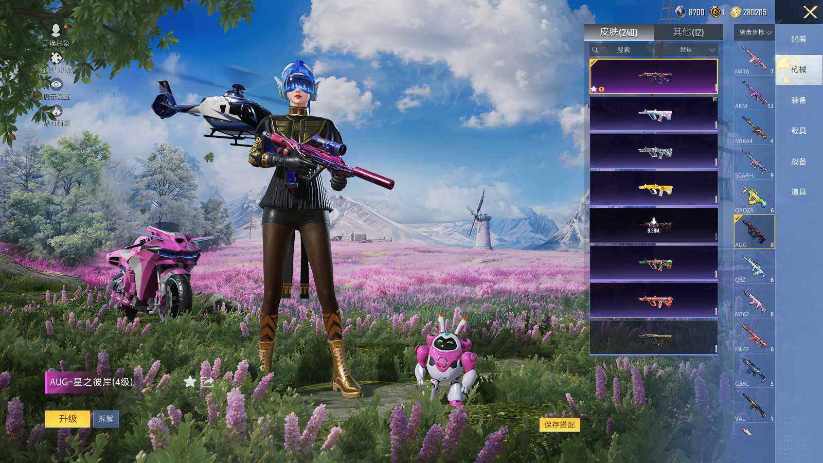 AKM-炫紫旋律,M16A4-葫芦兄弟,SCAR-L-梦幻火箭,SCAR-L-童趣迷兔,M416-五爪金龙,M416-心之恋语,GROZA-香水柠檬,AUG-星之彼岸,M762-甜蜜誓约,M762-激战未来,UZI-绮梦青鸾,UMP45-相思残雪,汤姆逊-怪笑疯兔,Kar98K-伏魔团,Kar98K-巳巳如意,M24-星之信仰,VSS-烈焰拳霸,Mini14-荧光虫舞,M249-古战神甲,平底锅-林间仙鹿