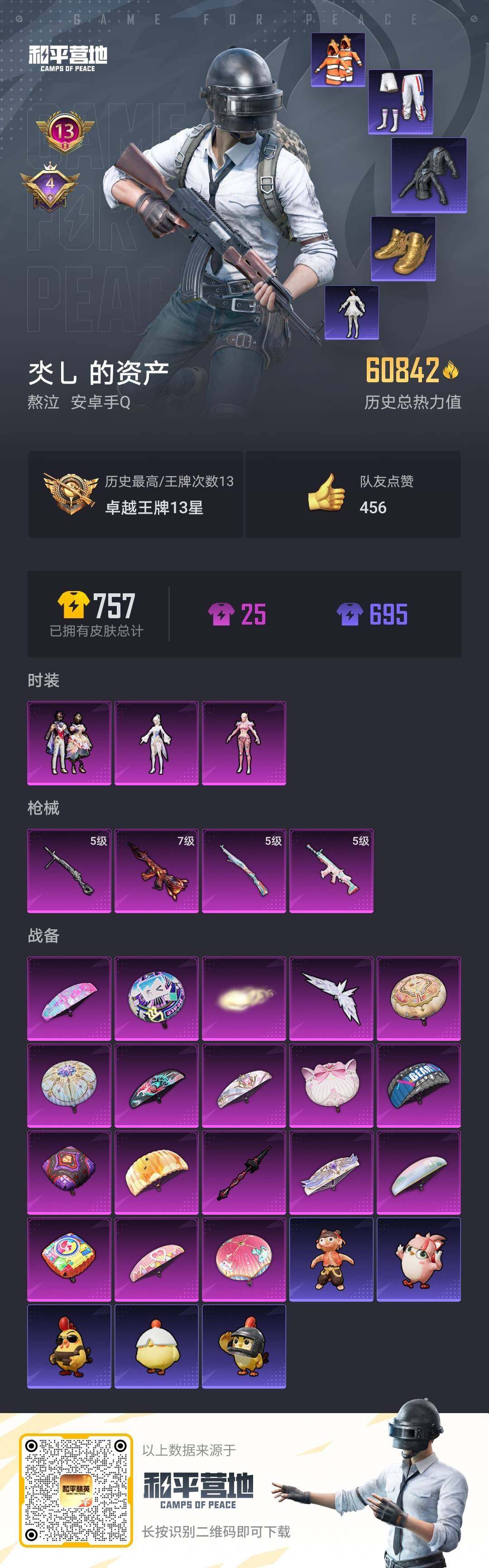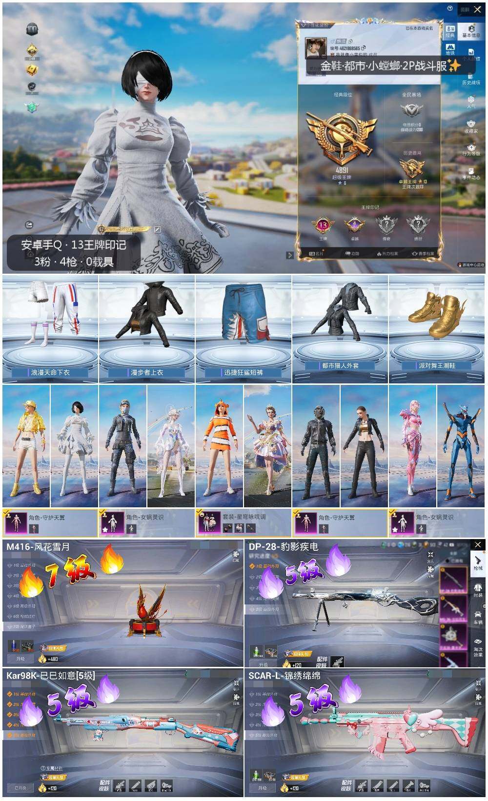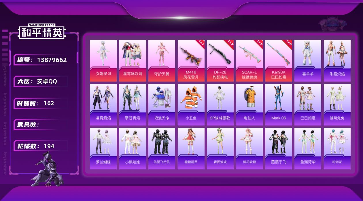 - PX_2088411- 可二次 安卓手Q-15王牌印记-7粉装-9特效枪-2载具-71195热力值-142套装-207枪皮-1卓越印记-1传奇印记, 【7粉装】,第五大道,洛天依,炙焰赤龙,小可学妹,彩虹鹿灵,金丰海韵,呆萌星弥, 【9特效枪】,AKM-梦之光华-7级,SCAR-L-纯梦嫁纱-7级,M416-五爪金龙-7级,GROZA-镜光银凌-5级,AUG-暖羊咩咩-5级,M762-青锋波束-5