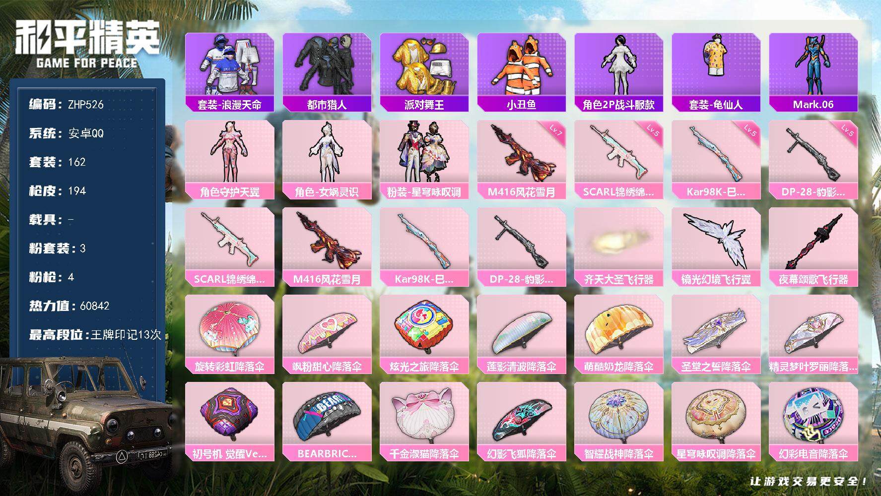 [13879662]可二次【店主推荐捡漏号!可直接换绑】/地铁满天赋 安卓 手Q-3粉装-4特效枪-3粉色飞行器-6w热力值-13王牌印记-162套装-194枪皮【热门品类】:套装-浪漫天命,套装-都市猎人,套装-派对舞王,套装-小丑鱼,角色-2P战斗服款,套装-龟仙人,角色-Mark.06【粉色套装】:角色-守护天翼,角色-女娲灵识,粉装-星穹咏叹调【粉色枪皮等级】:SCAR-L-锦绣绵绵(五级),M416-风花雪月(七级),Kar98K-巳巳如意(五级),DP-28-豹影疾电(五级)【粉色飞行器】:齐天大圣飞行器,镜光幻境飞行翼,夜幕颂歌飞行器