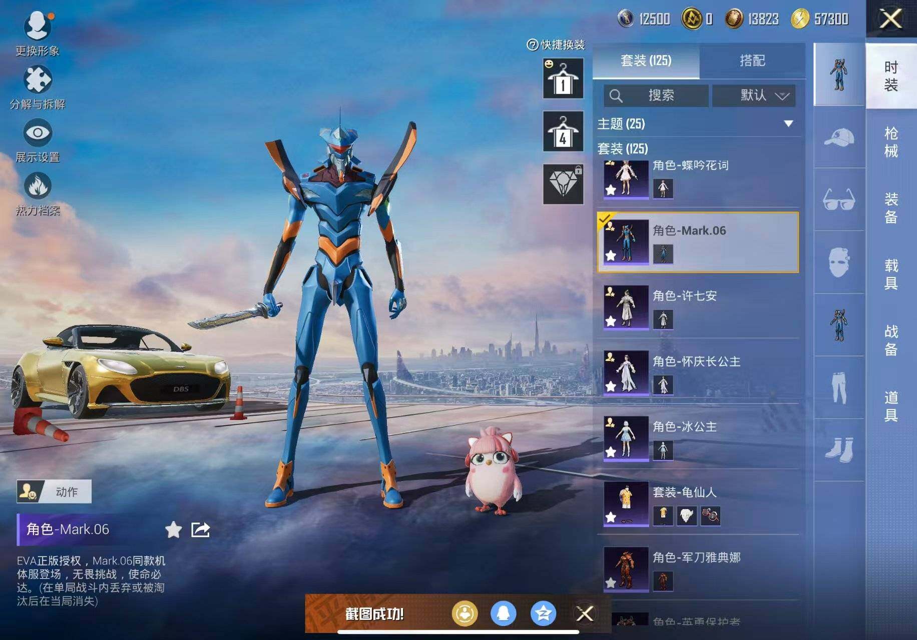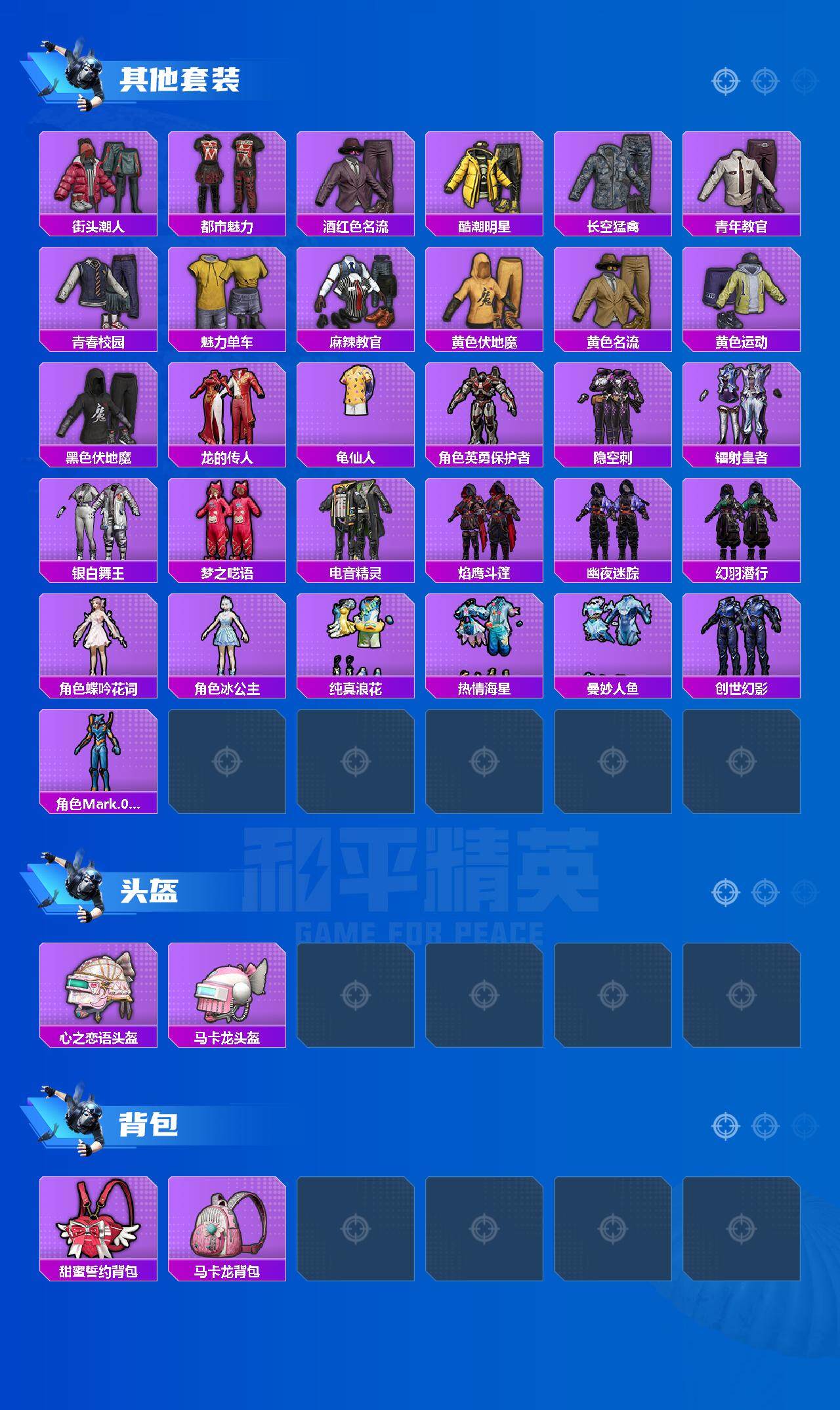 角色-军刀雅典娜,套装-龟仙人,套装-暗影哥特,角色-Mark.06,套装-极速红龙,套装-破蛋小黄鸡,角色-英勇保护者,套装-梦之呓语