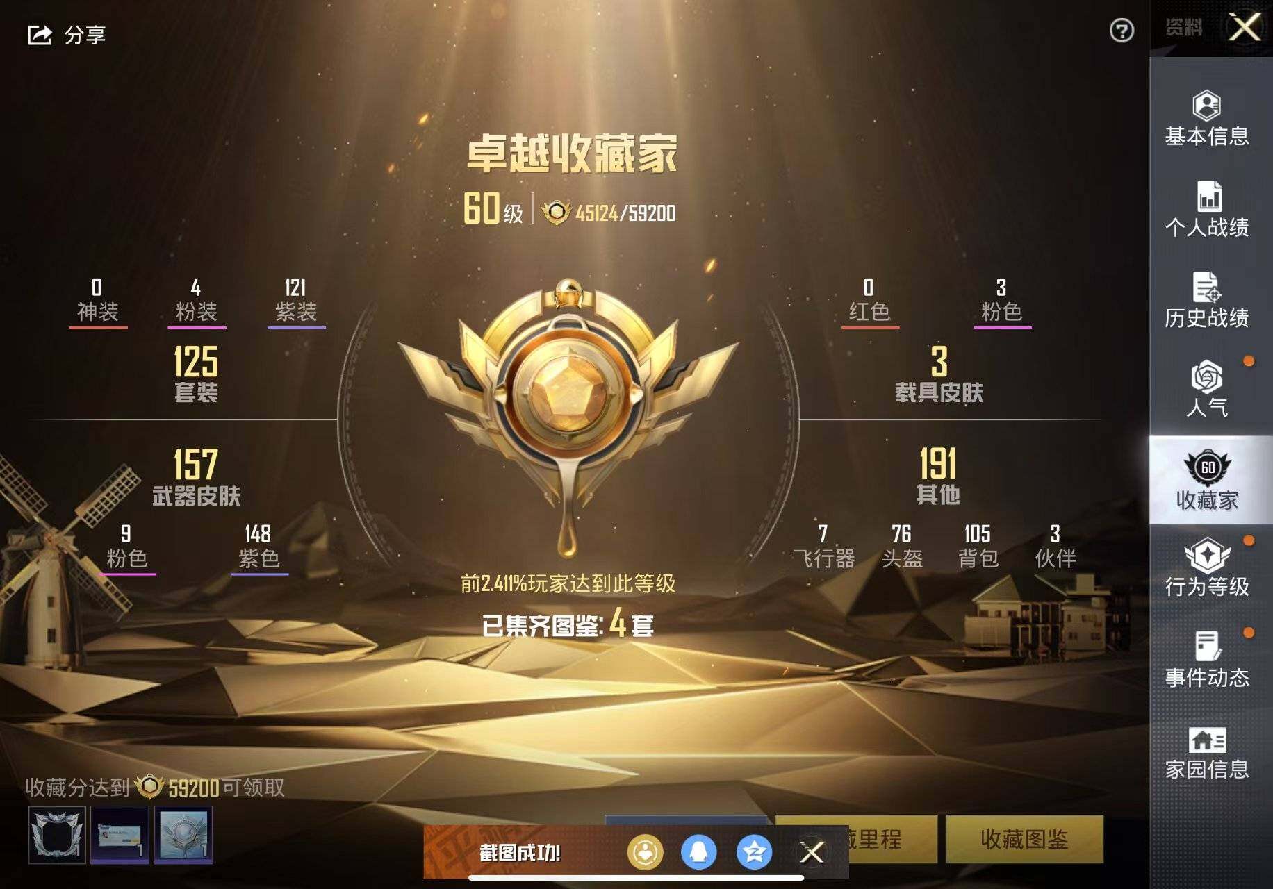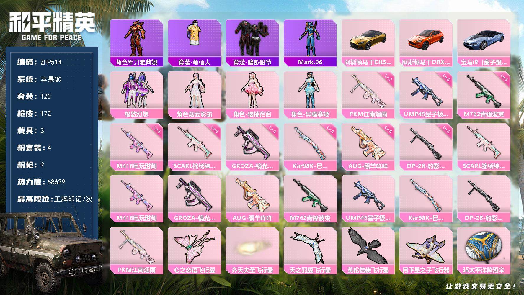 [13879768]苹果 手Q-4粉装-9特效枪-3载具-5粉色飞行器-58629热力值-7王牌印记-125套装-172枪皮