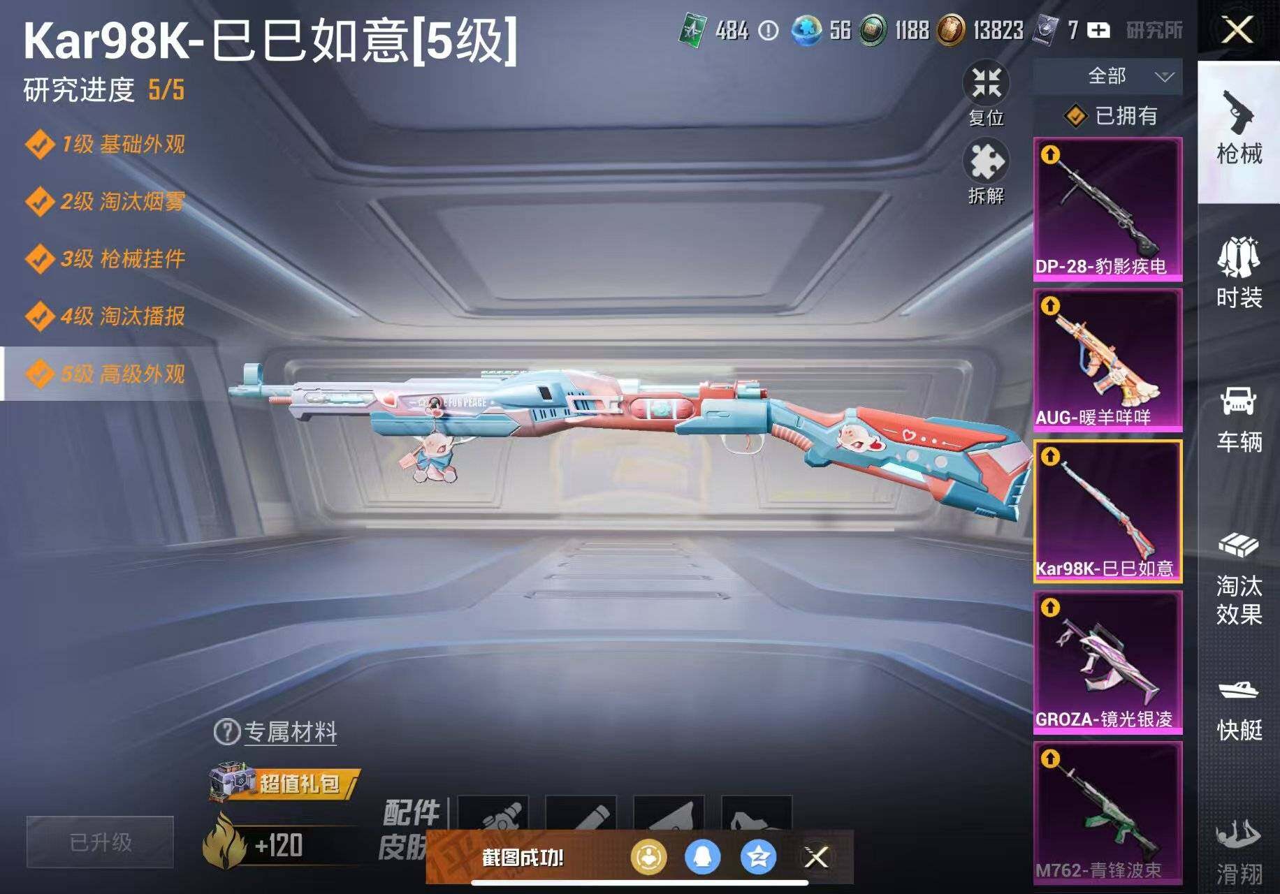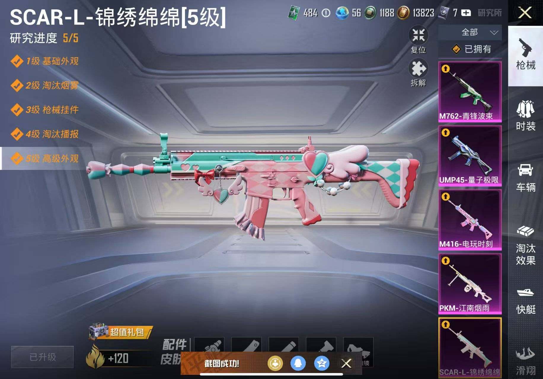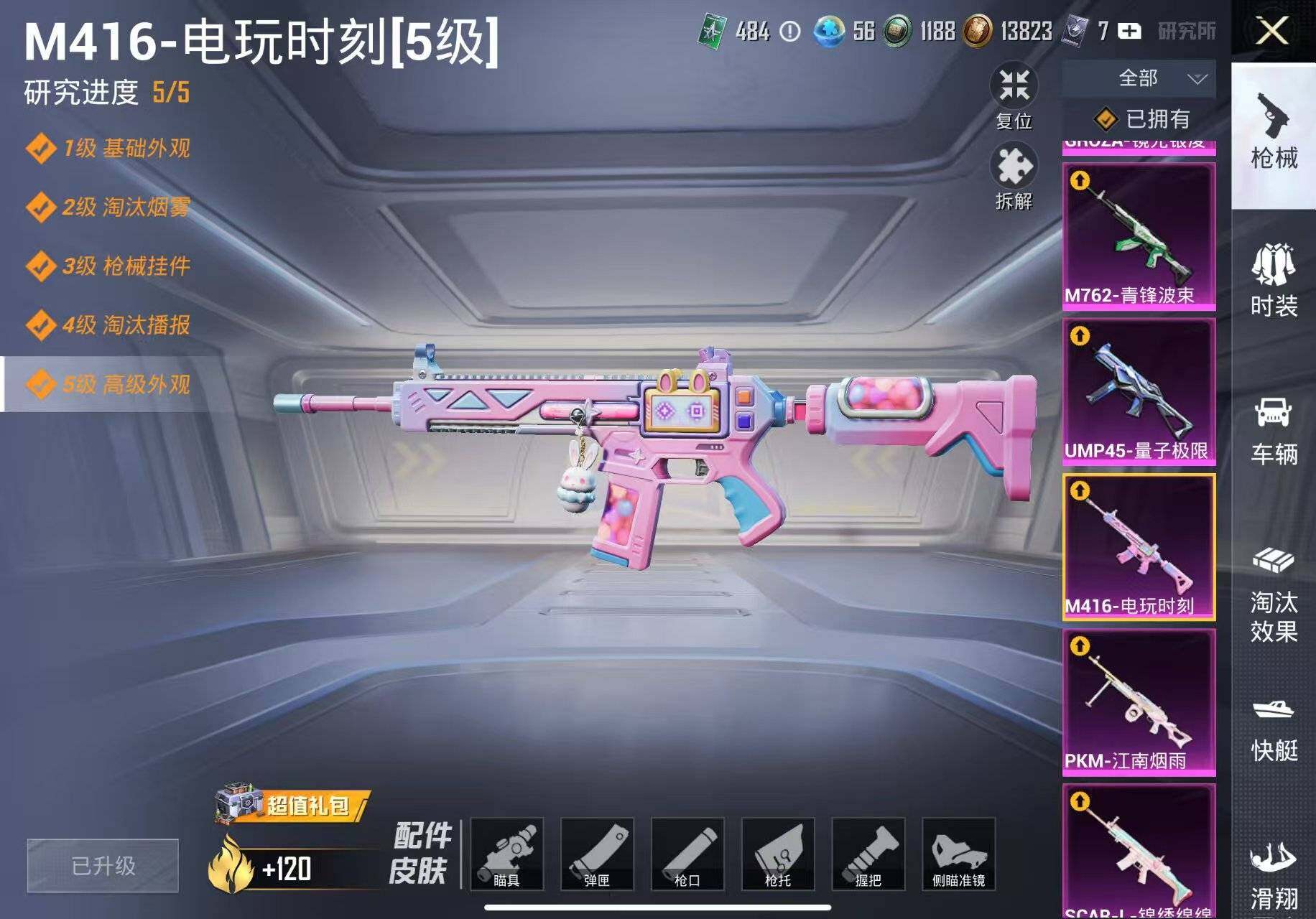 【粉色枪皮等级】:SCAR-L-锦绣绵绵(五级),M416-电玩时刻(五级),GROZA-镜光银凌(五级),AUG-暖羊咩咩(五级),M762-青锋波束(五级),UMP45-量子极限(五级),Kar98K-巳巳如意(五级),DP-28-豹影疾电(五级),PKM-江南烟雨(七级)