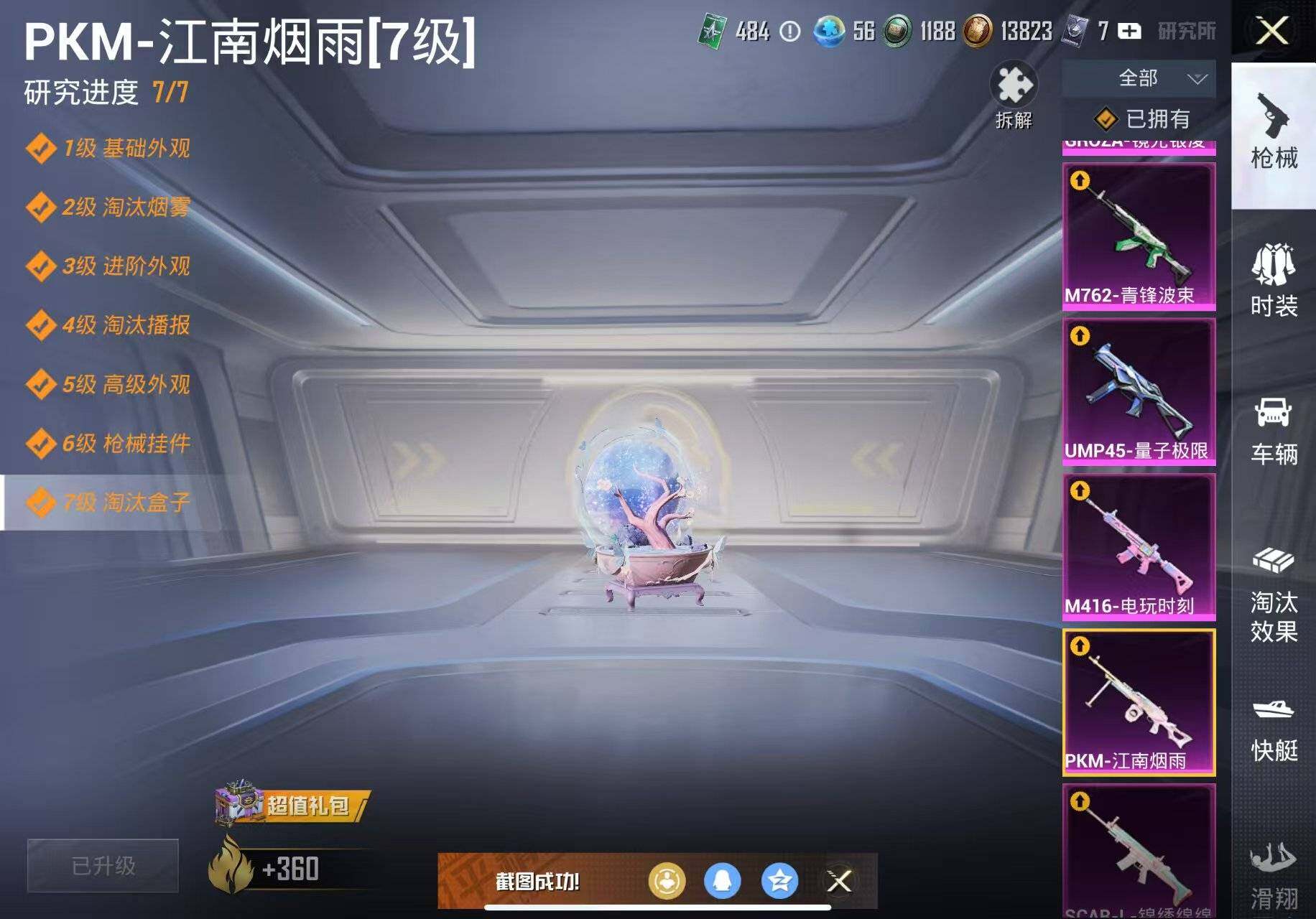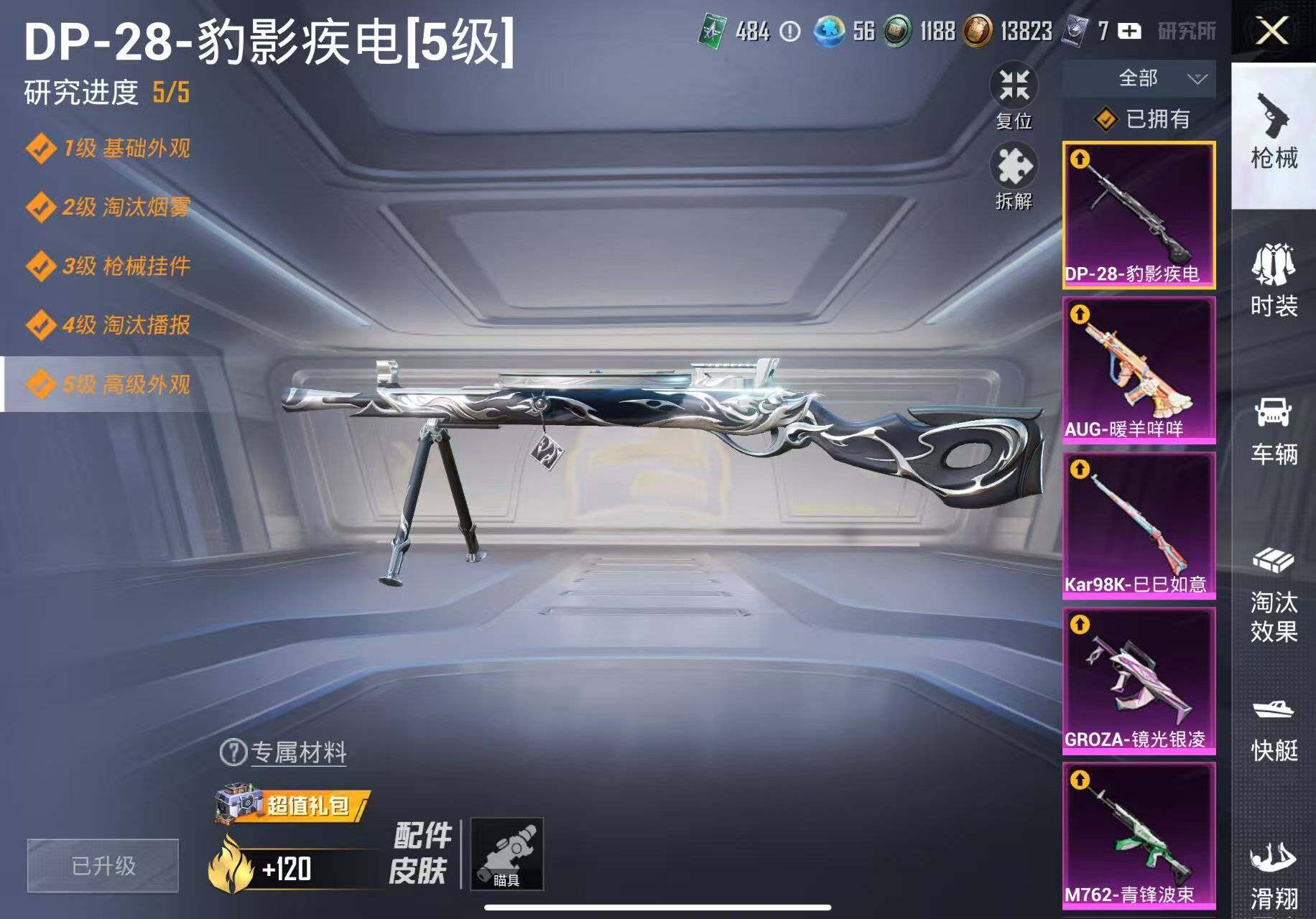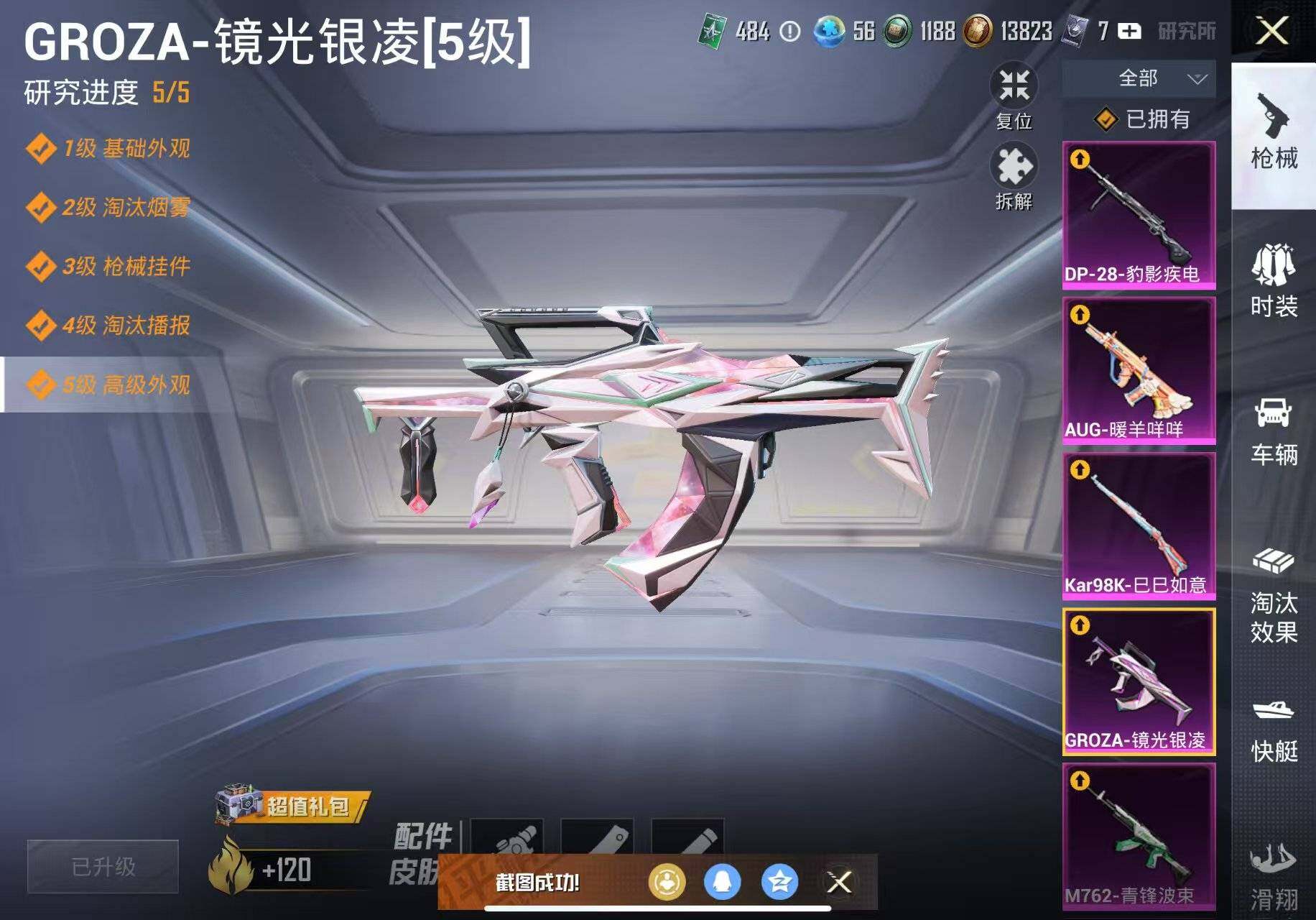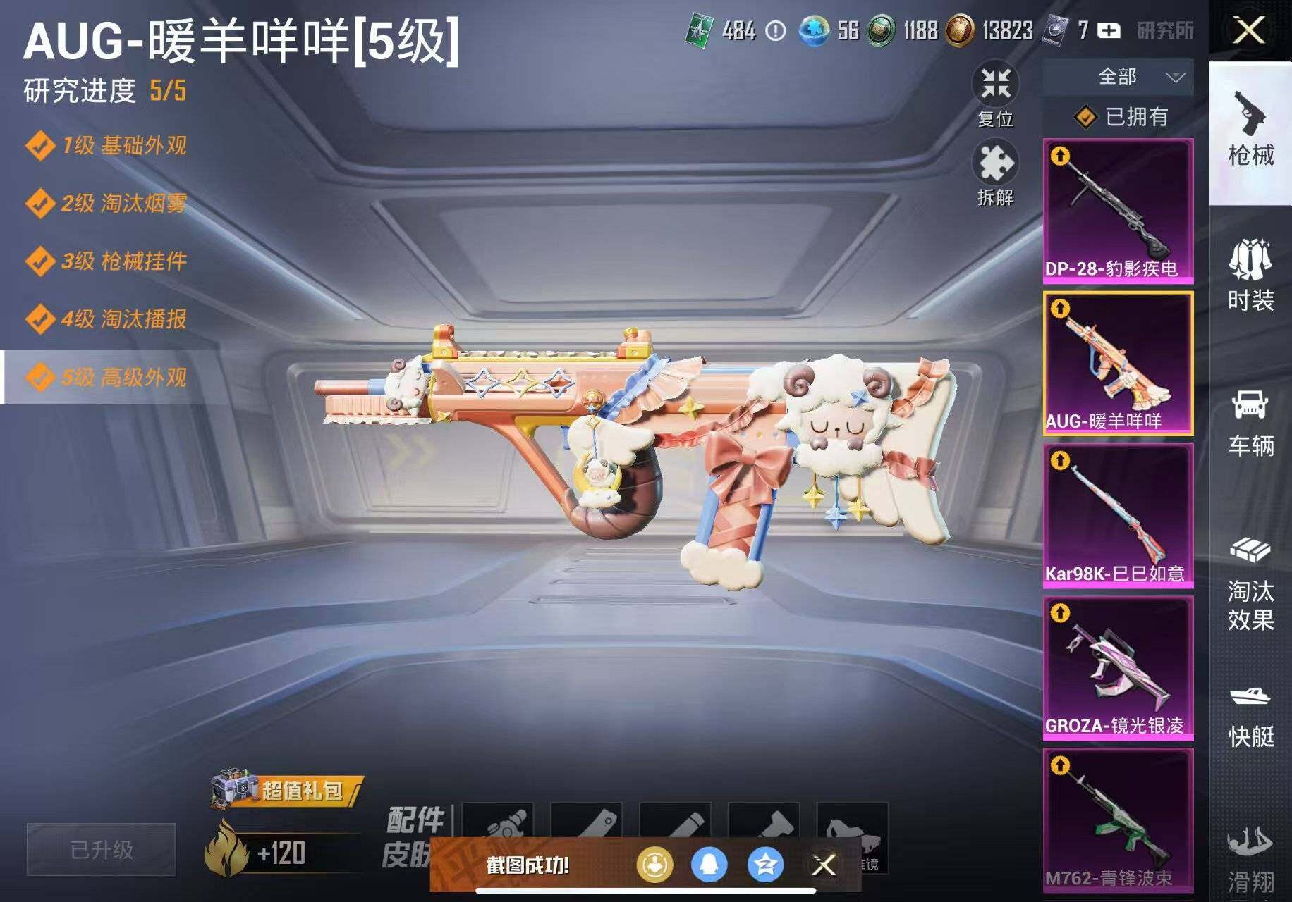 【粉色枪皮等级】:SCAR-L-锦绣绵绵(五级),M416-电玩时刻(五级),GROZA-镜光银凌(五级),AUG-暖羊咩咩(五级),M762-青锋波束(五级),UMP45-量子极限(五级),Kar98K-巳巳如意(五级),DP-28-豹影疾电(五级),PKM-江南烟雨(七级)