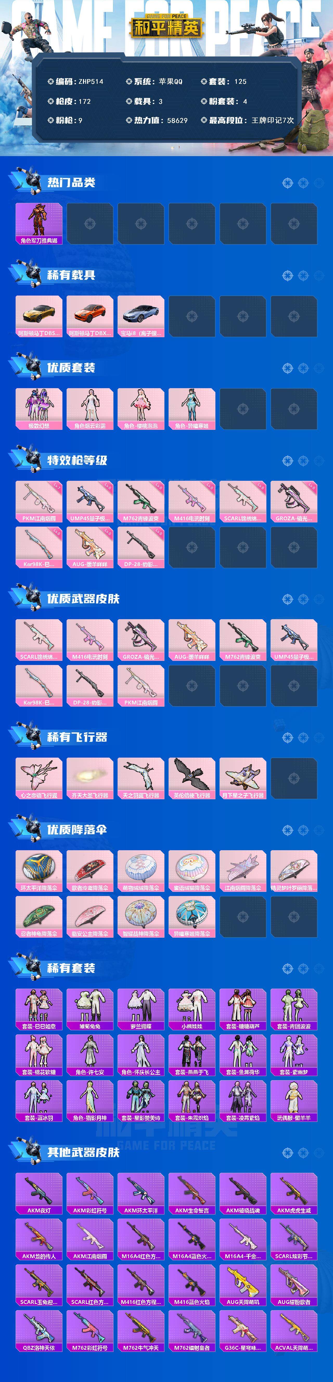 [13879768]苹果 手Q-4粉装-9特效枪-3载具-5粉色飞行器-58629热力值-7王牌印记-125套装-172枪皮 无二次介意勿拍!【热门品类】:角色-军刀雅典娜,套装-龟仙人,套装-暗影哥特,角色-Mark.06 【粉色载具】:阿斯顿马丁DBS(金),阿斯顿马丁DBX(橙),宝马i8(离子银) 【粉色套装】:粉装-极致幻想,角色-烟云彩露,角色-樱桃泡泡,角色-异瞳寒姬 【粉色枪皮等级】:SCAR-L-锦绣绵绵(五级),M416-电玩时刻(五级),GROZA-镜光银凌(五级),AUG-暖羊咩咩(五级),M762-青锋波束(五级),UMP45-量子极限(五级),Kar98K-巳巳如意(五级),DP-28-豹影疾电(五级),PKM-江南烟雨(七级) 【粉色枪皮】:SCAR-L-锦绣绵绵,M416-电玩时刻,GROZA-镜光银凌,AUG-暖羊咩咩,M762-青锋波束,UMP45-量子极限,Kar98K-巳巳如意,DP-28-豹影疾电,PKM-江南烟雨 【粉色飞行器】:心之恋语飞行翼,齐天大圣飞行器,天之羽翼飞行器,英伦信使飞行器,月下星之子飞行器 【粉色降落伞】:环太平洋降落伞,歌者泠鸢降落伞,萌物绒绒降落伞,蜜语绒猫降落伞,江南烟雨降落伞,精灵梦叶罗丽降落伞,忍者神龟降落伞,临安公主降落伞,智耀战神降落伞,异瞳寒姬降落伞 【稀有套装】:套装-龟仙人,套装-巳巳如意,套装-雏菊兔兔,套装-萝兰蝴蝶,套装-小熊娃娃,套装-糖糖葫芦,套装-青团波波,套装-棉花软糖,角色-许七安,角色-怀庆长公主,套装-燕燕于飞,套装-鱼渊荷华,套装-紫幽梦,套装-蓝冰羽,角色-猎影月神,套装-星影赞美诗,套装-朱霞炽焰,套装-凌霄紫焰,玩偶服-懒羊羊 【稀有枪皮】:AKM-夜灯,AKM-彩虹符号,AKM-江南烟雨,AKM-环太平洋,AKM-生命誓言,AKM-破晓战魂,AKM-虎虎生威,AKM-龙的传人,M16A4-红色方程式,M16A4-蓝色火焰,M16A4-千金淑猫,SCAR-L-炫彩节奏,SCAR-L-玉兔迎春,SCAR-L-红色方程式,M416-红色方程式,M416-蓝色火焰,AUG-天降萌叽,AUG-耀粉歌者,QBZ-洛神天依,M762-彩虹符号,M762-牛气冲天,M762-镭射皇者,G36C-星穹咏叹调,AC-VAL-天降萌叽,蜜獾-天降萌叽,ARX-凌霄紫焰,UZI-天降萌叽,UZI