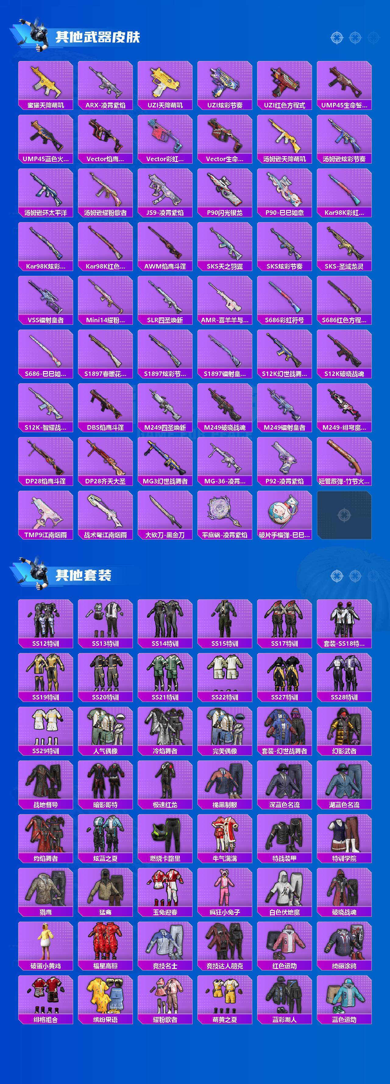 【稀有枪皮】:AKM-夜灯,AKM-彩虹符号,AKM-江南烟雨,AKM-环太平洋,AKM-生命誓言,AKM-破晓战魂,AKM-虎虎生威,AKM-龙的传人,M16A4-红色方程式,M16A4-蓝色火焰,M16A4-千金淑猫,SCAR-L-炫彩节奏,SCAR-L-玉兔迎春,SCAR-L-红色方程式,M416-红色方程式,M416-蓝色火焰,AUG-天降萌叽,AUG-耀粉歌者,QBZ-洛神天依,M762-彩虹符号,M762-牛气冲天,M762-镭射皇者,G36C-星穹咏叹调,AC-VAL-天降萌叽,蜜獾-天降萌叽,ARX-凌霄紫焰,UZI-天降萌叽,UZI