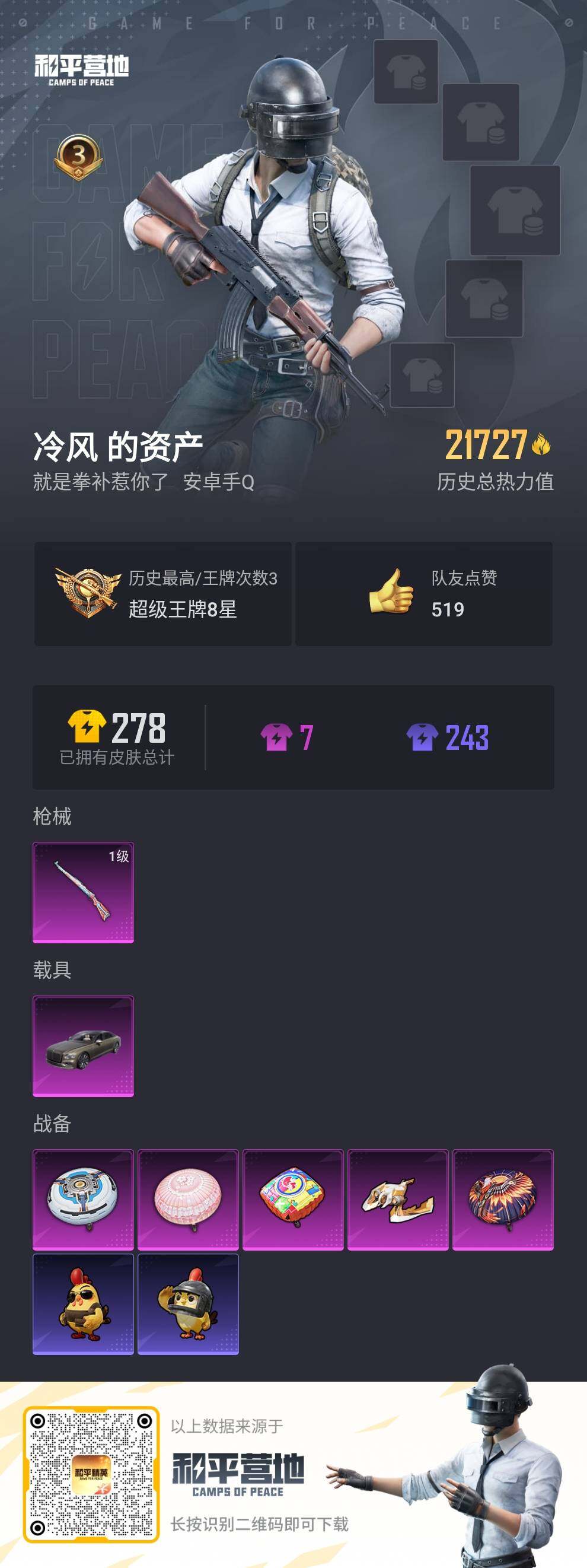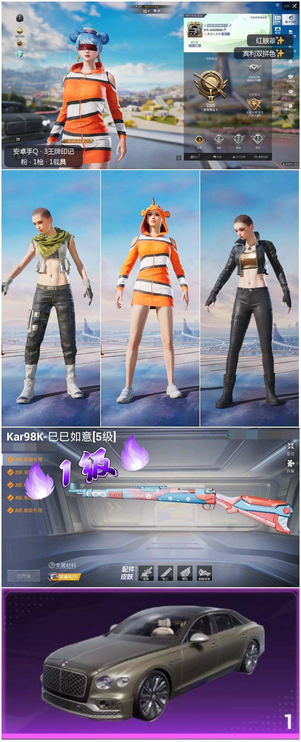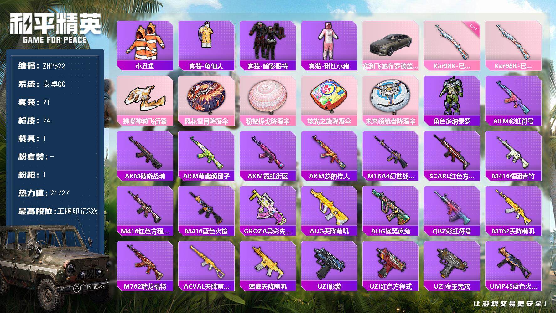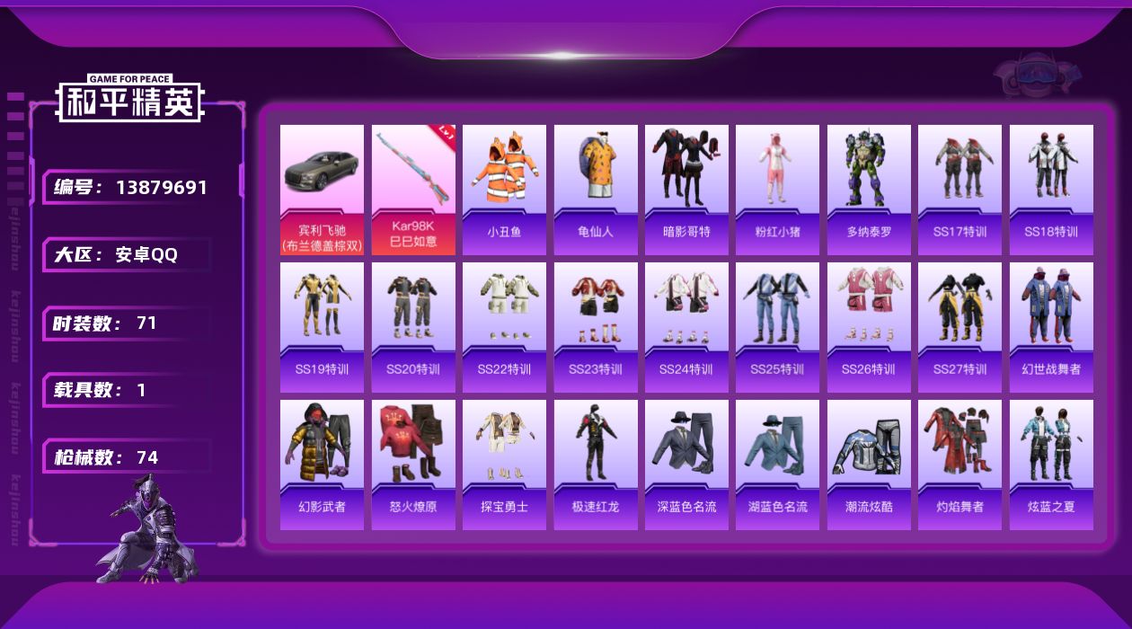 [13879691]可二次【店主推荐捡漏号!可直接换绑】 安卓 手Q-1特效枪-1载具-1粉色飞行器-2.1w热力值-3王牌印记-71套装-74枪皮【热门品类】:套装-小丑鱼,套装-龟仙人,套装-暗影哥特,套装-粉红小猪【粉色载具】:宾利飞驰(布罗德盖棕双色)【粉色枪皮等级】:Kar98K-巳巳如意(一级)【粉色飞行器】:拂晓神骑飞行器