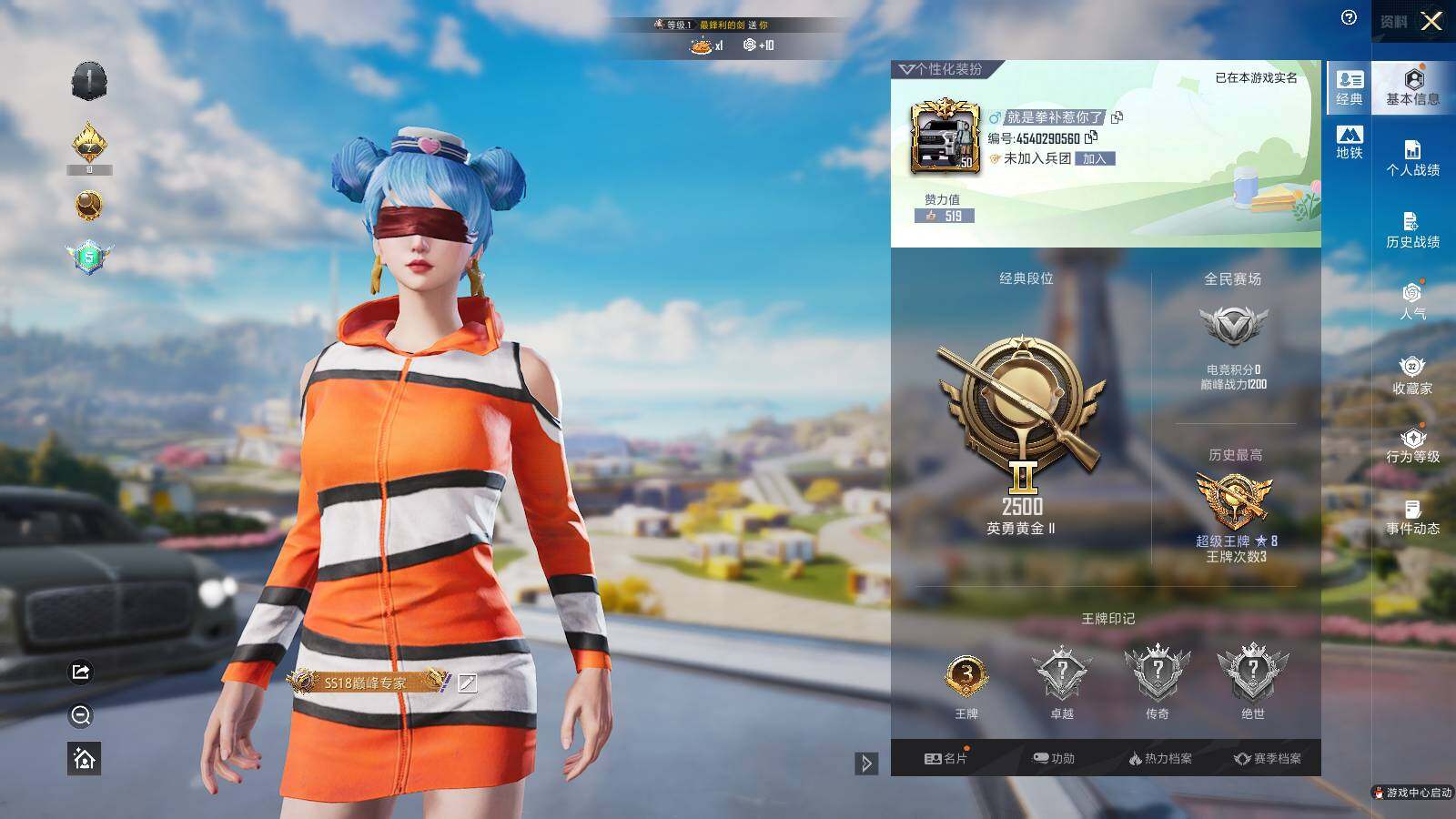 - [10197544]实名: 可修改 时装数: 687 载具数: 1 枪械数: 215 战备数: 164 热门装扮: 迅捷狂鲨,智能音符,山涧鹿灵,呆萌星弥,未来歌姬,金域紫灵,幻影飞狐 载具: 玛莎拉蒂Quattroporte(夜幕蓝) 稀有枪皮: M416风花雪月,GROZA-镜光银凌,Kar98K-巳巳如意