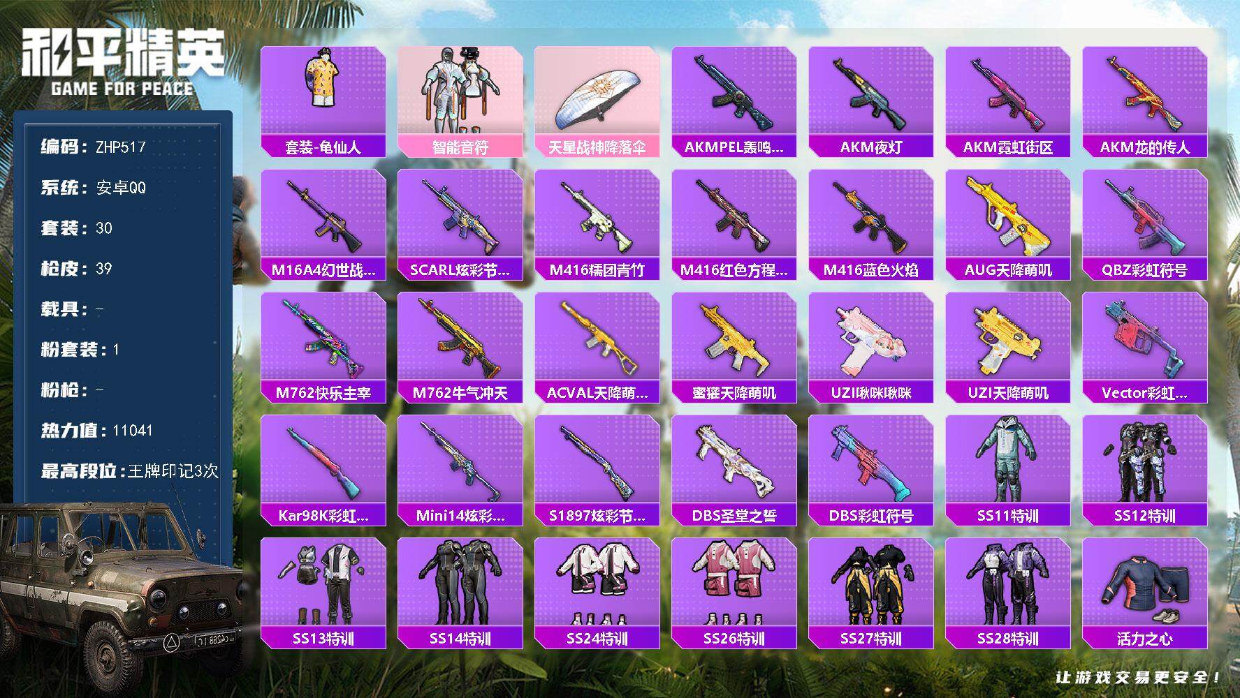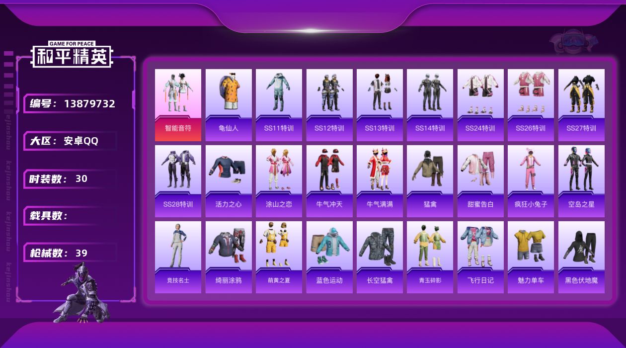 [13879732]可二次【店主推荐捡漏号!可直接换绑】 安卓 手Q-1粉装-1.1w热力值-3王牌印记-30套装-39枪皮【热门品类】:套装-龟仙人【粉色套装】:粉装-智能音符