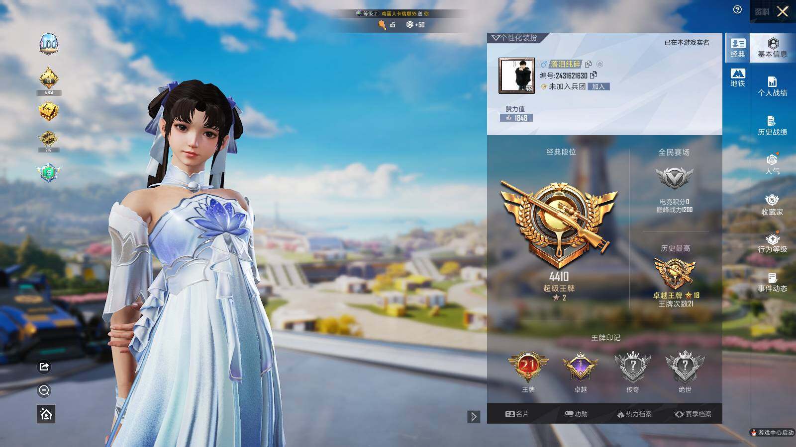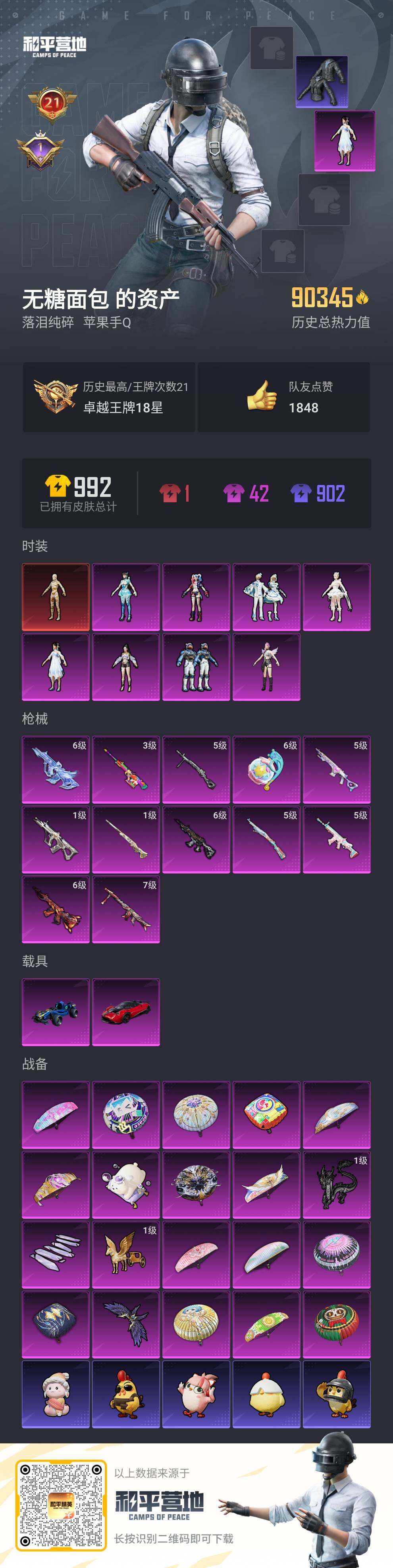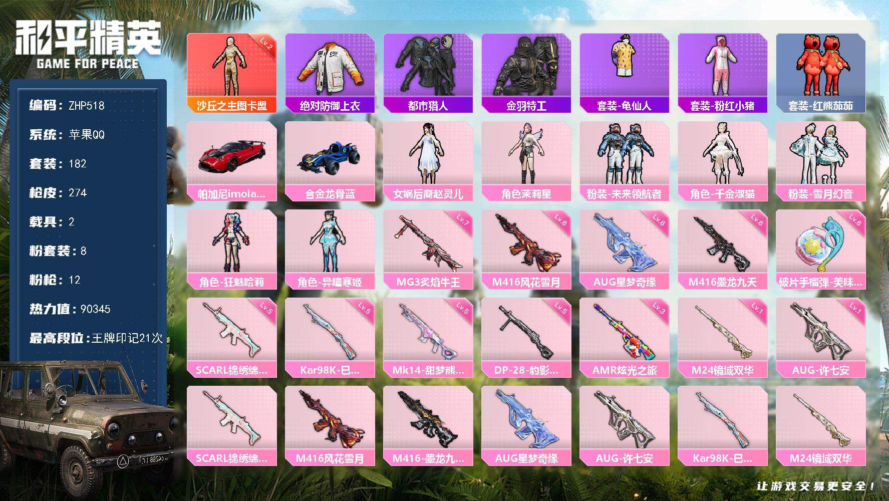 [13879720]【店主推荐捡漏号!可直接换绑】/素材身法号/扭蛋碎片767/地铁满天赋 苹果 手Q-1神装-8粉装-12特效枪-2载具-5粉色飞行器-9w热力值-21王牌印记-182套装-274枪皮【红色神装等级】:沙丘之主-图卡盟(二级)【热门品类】:绝对防御上衣,套装-都市猎人,套装-金羽特工,套装-龟仙人,套装-粉红小猪,套装-红熊茄茄【粉色载具】:帕加尼imola(光影红),合金龙骨(蓝)【粉色套装】:女娲后裔-赵灵儿,角色-茉莉星,粉装-未来领航者,角色-千金淑猫,粉装-雪月幻音,角色-狂魅哈莉,角色-异瞳寒姬【粉色枪皮等级】:SCAR-L-锦绣绵绵(五级),M416-风花雪月(六级),M416-墨龙九天(六级),AUG-星梦奇缘(六级),AUG-许七安(一级),Kar98K-巳巳如意(五级),M24-镜域双华(一级),Mk14-甜梦熊击(五级),AMR-炫光之旅(三级),DP-28-豹影疾电(五级),MG3-炙焰牛王(七级),破片手榴弹-美味星星糖(六级)【粉色飞行器】:酣梦熊熊飞行器,星夜魔法师飞行翼,沙丘之主天马,镜域双华-灵镜之阶,龙翔九天飞行器