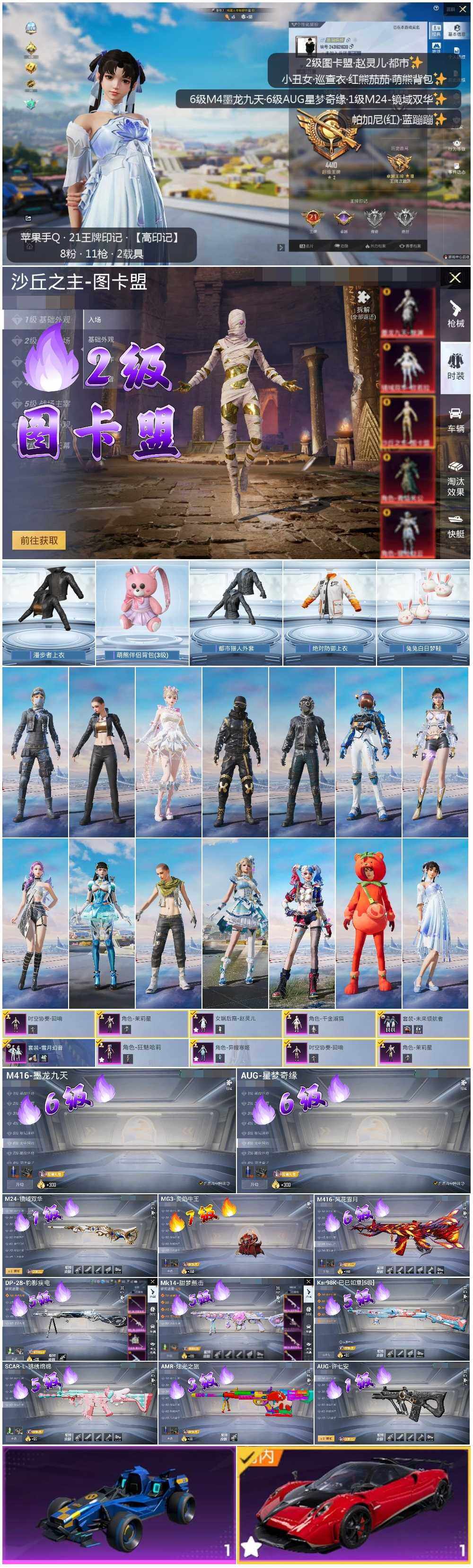- [12259376]1红装 6粉装 10特效枪 8印记 可二次 可修改实名 优质装备:圣域龙灵-瑞拉,一级圣域龙灵-瑞拉(1级瑞拉),梦幻火箭(新101)(新火箭少女101粉色套装),M416风花雪月,GROZA焦糖拿铁,AKM星际浪客,SCAR-L-锦绣绵绵,M24镜域双华,Groza巴啦啦小魔仙,七级GROZA-焦糖拿铁,七级M416-风花雪月,AUG-暖羊咩咩,Kar98K-圣域龙灵,幻彩电音,Kar98K-巳巳如意 热门装扮:歌者泠鸢,蜜语绒猫,小蓝,金丰海韵 稀有枪皮:DP-28-豹影疾电 五级特效枪:五级Kar98K-巳巳如意,五级DP-28-豹影疾电,五级AUG-暖羊咩咩,五级SCAR-L-锦绣绵绵 四级特效枪:四级AKM-星际浪客 三级特效枪:三级Kar98K-圣域龙灵,三级M24-镜域双华 一级特效枪:一级GROZA-巴啦啦小魔仙 紫色装扮:田园牧歌,轻风白浪,和煦暖阳,SS22特训,SS23特训,摩登艾咪,龙舌兰冰茶,SS21特训,紫芒星,SS31特训套装,SS30特训套装,SS33特训套装,顶瓜瓜,吉莉礼服,浓情摩卡,魔力冰咖,都市漫游者,野性战心,长空猛禽,霓虹街区,缤纷果语,飞行日记,鹤鸣,龟仙人,冰河战士,龙魂突击队,蝶变,香桃花海,荒原牛仔,云鹰凌岚,柠萌假日,海岛探路者,空岛之星,王牌教练,SS29特训,星途旅人,白光莹,纯真浪花,热情海星,曼妙人鱼,SS28特训,冰公主,异域银装,鱼渊荷华,玉兔迎春,燕燕于飞,巳巳如意,竞技名士,摩登魅猫,街头风暴,银尘,情公主,SS24特训(SS24特训套装),湖泊玉兰,焰鹰斗篷,幻羽潜行,幽夜迷踪,SS27特训,无暇誓言,童真绒兔,萌趣绒叽,SS26特训,春光漫游,快闪甜心,贝斯之夜,智谋强哥,大橘大利,星渊小夜曲,星影赞美诗,春日漫步,粉恋花,蓝冰羽,紫幽梦,SS32特训服(SS32特训套装),青玉碎影,萌黄之夏,暗夜风云,纯白跃动,蓝调潮影,糖霜甜心,恋语绒绒,光之冒险,幽幻花璃 优质战备:精灵梦叶罗丽降落伞,星途旅人降落伞,深渊漩涡飞行器,宇宙意志降落伞,金丰海韵降落伞,千金淑猫降落伞,绝色倾城降落伞,镜域双华降落伞,镜域双华-灵镜之阶,蜜语绒猫降落伞,沙丘之主降落伞,智耀战神降落伞,圣域龙灵降落伞,圣域金龙飞行器,纯梦嫁纱降落伞,梦幻火箭降落伞