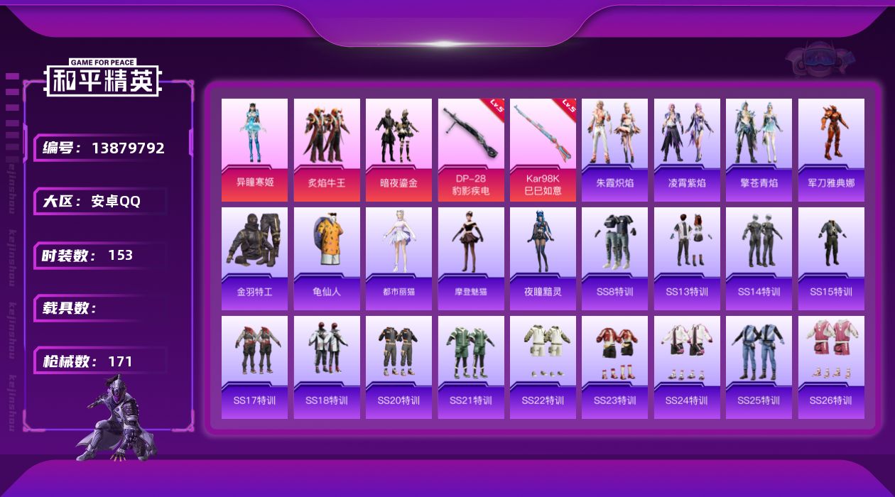 [13879792]【店主推荐捡漏号!可直接换绑】 安卓 手Q-3粉装-2特效枪-0载具-1粉色飞行器-5.4w热力值-5王牌印记-153套装-171枪皮【热门品类】:套装-奇异狩猎者,角色-军刀雅典娜,套装-金羽特工,套装-龟仙人【粉色套装】:粉装-炙焰牛王,粉装-暗夜鎏金,角色-异瞳寒姬【粉色枪皮等级】:Kar98K-巳巳如意(五级),DP-28-豹影疾电(五级)【粉色飞行器】:梦幻火箭飞行器