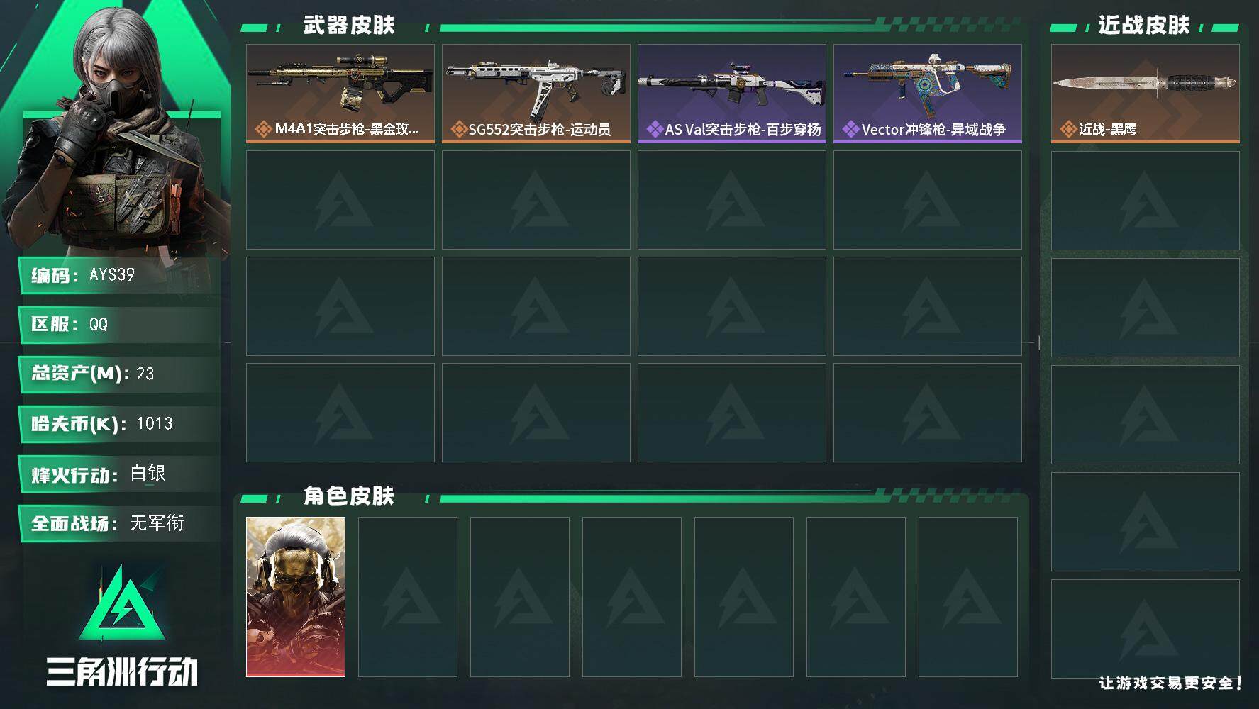 [13880002]【店主推荐捡漏号!可直接换绑】总资产23m 1013哈伏币-20m流动资产-25烽火等级-白银-2战场等级-无军衔 【干员外观】:红狼-蚀金玫瑰 【近战皮肤】:近战-黑鹰 【传说级普通外观】:M4A1突击步枪-蚀金玫瑰,SG552突击步枪-运动员 【史诗级普通外观】:AS Val突击步枪-百步穿杨,Vector冲锋枪-异域战争 【普通级普通外观】:M4A1突击步枪-粉色涂装,QBZ95-1突击步枪-高雅黑,K416突击步枪-几何迷彩,SCAR-H战斗步枪-数码迷彩,QCQ171冲锋枪-三角洲力量,M1014霰弹枪-高雅黑,SKS射手步枪-三角洲力量 【军牌】:军牌-神秘艺术,军牌-信誉优秀,军牌-小心鳄鱼 【挂饰】:挂饰-蚀金玫瑰,挂饰-崩岩重炮,挂饰-暗行哨兵