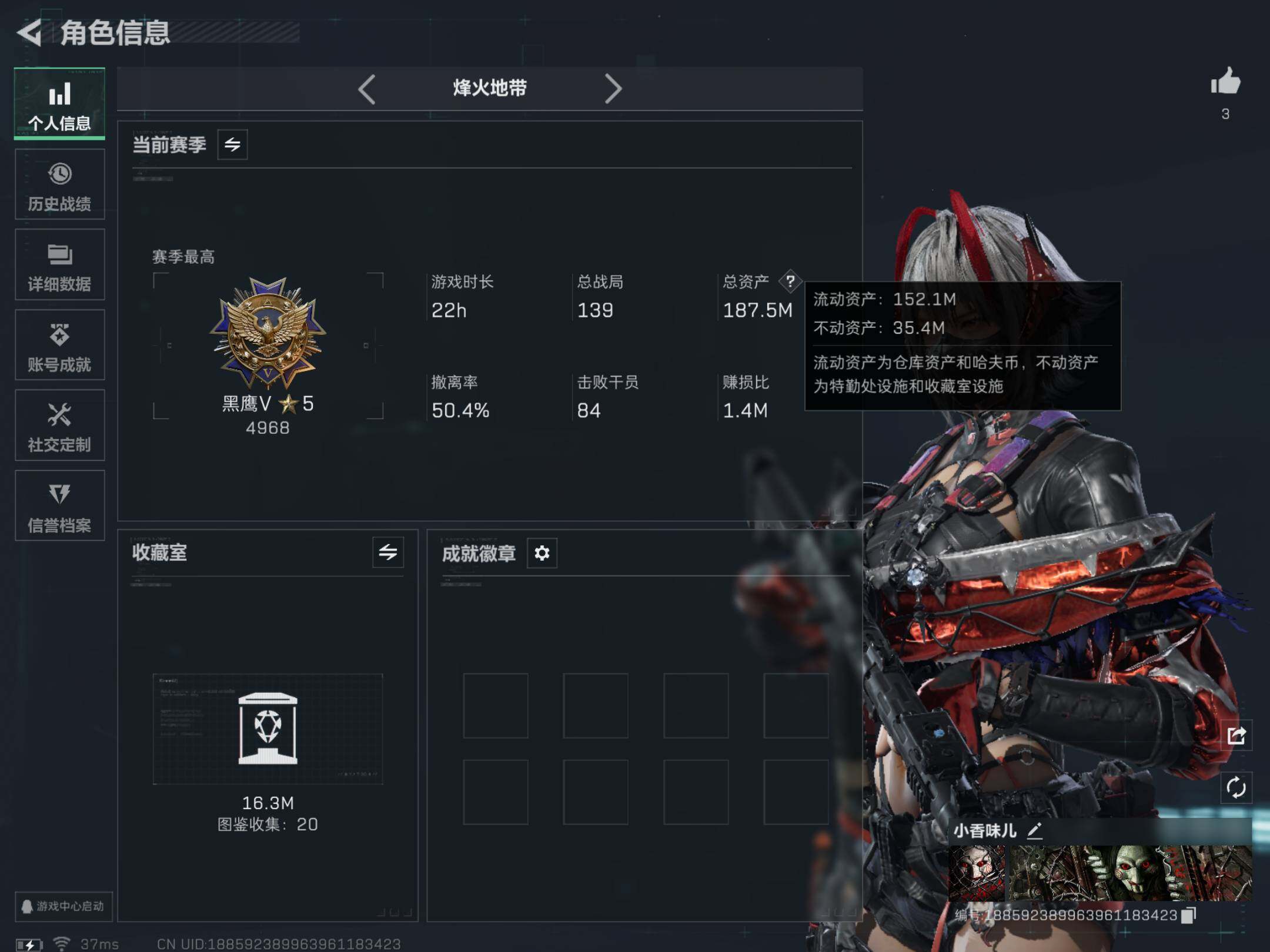 [13879957]可直接换绑 总资产187m 85714k哈伏币-152m流动资产-60烽火等级-黑鹰-22战场等级-军士长