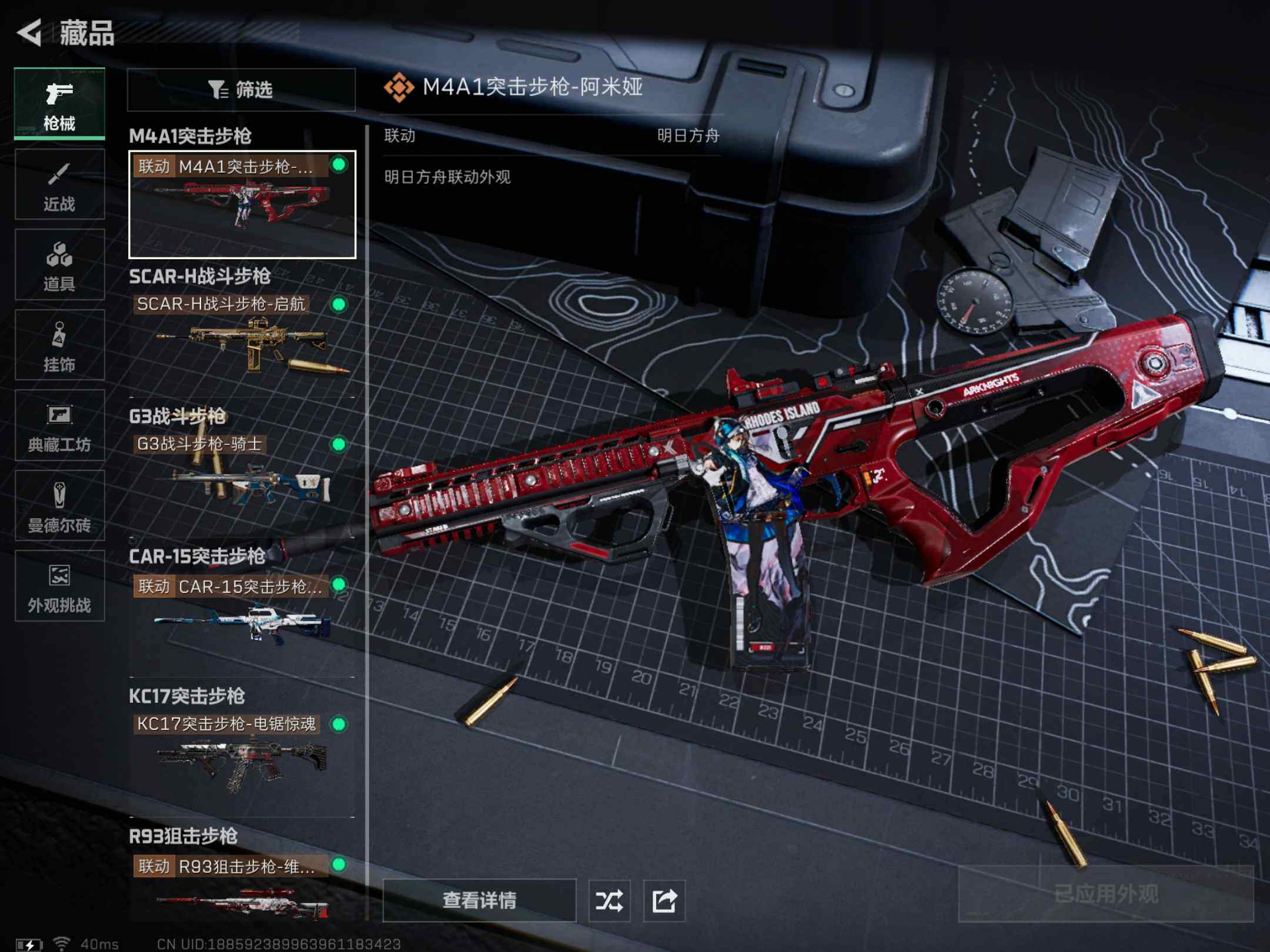【传说级普通外观】:M4A1突击步枪-阿米娅,SCAR-H战斗步枪-启航,CAR-15突击步枪-阿米娅,KC17突击步枪-电锯惊魂,R93狙击步枪-维什戴尔