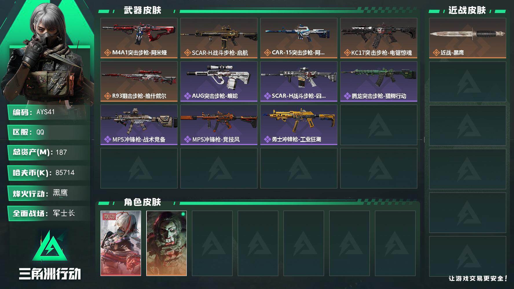 [13879957]可直接换绑 总资产187m 85714k哈伏币-152m流动资产-60烽火等级-黑鹰-22战场等级-军士长 【干员外观】:骇爪-维什戴尔,红狼-电锯惊魂 【近战皮肤】:近战-黑鹰 【传说级普通外观】:M4A1突击步枪-阿米娅,SCAR-H战斗步枪-启航,CAR-15突击步枪-阿米娅,KC17突击步枪-电锯惊魂,R93狙击步枪-维什戴尔 【史诗级普通外观】:AUG突击步枪-蝮蛇,SCAR-H战斗步枪-囚徒,腾龙突击步枪-猎鳄行动,MP5冲锋枪-战术竞备,MP5冲锋枪-竞技风,勇士冲锋枪-工业狂潮 【稀有级普通外观】:SCAR-H战斗步枪-荣耀列队,Vector冲锋枪-先锋,SMG-45-行动开启,M1014霰弹枪-幻影结构,Mini-14射手步枪-荣耀列队,SKS射手步枪-弄臣,SR-25射手步枪-开拓,SV-98狙击步枪-星链科技,G18-星链科技 【普通级普通外观】:M4A1突击步枪-粉色涂装,M4A1突击步枪-高雅黑,M4A1突击步枪-海色,QBZ95-1突击步枪-高雅黑,QBZ95-1突击步枪-海浪,QBZ191突击步枪-三角洲力量,K416突击步枪-几何迷彩,K416突击步枪-高雅黑,AUG突击步枪-浅蓝涂装,M7战斗步枪-红色涂装,SG552突击步枪-浅蓝涂装,SG552突击步枪-海浪,SCAR-H战斗步枪-数码迷彩,MP5冲锋枪-黄蜂,UZI冲锋枪-海色,M1014霰弹枪-高雅黑,M1014霰弹枪-海浪,M249轻机枪-黄蜂,SR-25射手步枪-黄蜂,SV-98狙击步枪-红色涂装 【军牌】:军牌-展示,军牌-永恒,军牌-零号大坝,军牌-幸福国,军牌-信誉优秀 【挂饰】:挂饰-维什戴尔,挂饰-诡影狙击兵,挂饰-诡影喷火兵,挂饰-崩岩重炮,挂饰-启程 【热门藏品】:非洲之心
