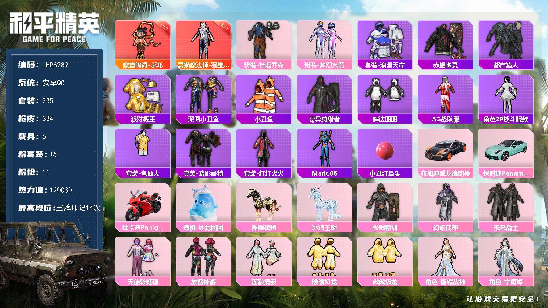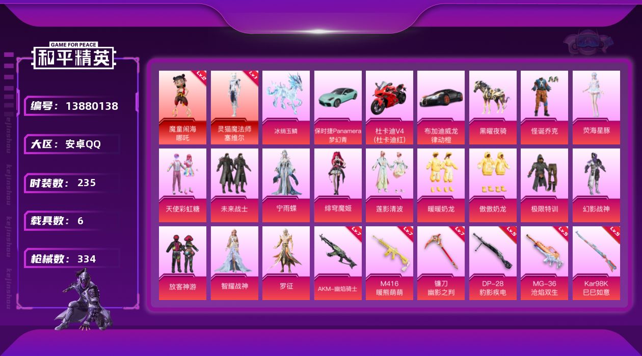 - PX_2101836- 安卓手Q-10王牌印记-7粉装-7特效枪-2载具-82889热力值-152套装-235枪皮-1卓越印记-1传奇印记 【7粉装】,狂花道·不知火舞,古堡领主,深海曼妙,金属狂野,向日葵,金域紫灵,快乐主宰 【7特效枪】AKM-炫紫旋律-7级 SCAR-L-锦绣绵绵-5级 GROZA-镜光银凌-5级 AUG-暖羊咩咩-5级 Kar98K-伏魔团-4级 Kar98K-巳巳如意-5