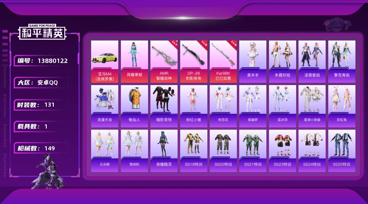 - [12956342]钱包1.1可改 素材身法号/可8套6级红装随意切换/满6级宝马M4(灿阳金)/璀璨碎片2309 安卓 微信-8神装-14粉装-15特效枪-6载具-10粉色飞行器-10.2w热力值-11王牌印记-128套装-203枪皮【红色载具】:宝马M4(灿阳金)(六级)【红色神装等级】:魔童闹海-哪吒(六级),灵猫魔法师-塞维尔(一级),圣域龙灵-瑞拉(一级),金蛇镇世-烛九(一级),幽焰骑士-维塔(一级),镜域双华-欧若拉(一级)【热门品类】:粉装-梦幻火箭,套装-浪漫天命,套装-龟仙人,套装-暗影哥特,角色-Mark.06,角色-六号稻草人【粉色载具】:宝马M4(灿阳金),盛世惊鸿摩托车,星梦玉骢,护世瑞兽,冰绡玉鳞,辉羽雀灵自行车【粉色套装】:粉装-梦幻火箭,粉装-彩虹甜喵,粉装-霞光圣骑,粉装-第五大道,角色-呆萌星弥,角色-小可学妹,角色-小叽联名款,角色-美雪,粉装-金丰海韵,角色-千金淑猫,角色-翎光蝶翼,角色-圣辉之星,粉装-星穹咏叹调,角色-羊梦糖心【粉色枪皮等级】:AKM-幽焰骑士(三级),M16A4-垂柳戏鸭(六级),SCAR-L-魔童闹海 哪吒(三级),M416-风花雪月(一级),M416-灵猫魔法师(六级),GROZA-镜光银凌(五级),Vector-最终圣卫者(三级),AKS-74U-星穹咏叹调(五级),Kar98K-巳巳如意(五级),Kar98K-圣域龙灵(二级),M24-镜域双华(三级),DP-28-千金淑猫(一级),DP-28-豹影疾电(五级),平底锅-喜羊羊与灰太狼(三级)【粉色飞行器】:镜域双华-灵镜之阶,曦光华影飞行器,幽焰列车飞行器,万象金身飞行器,圣域金龙飞行器,雀灵庇佑飞行器,终晖之翼飞行器,灵猫魔法师飞行器,飞天猪飞行器