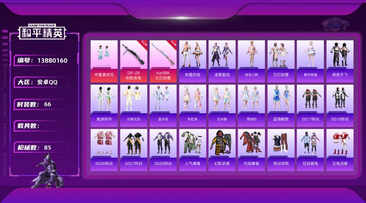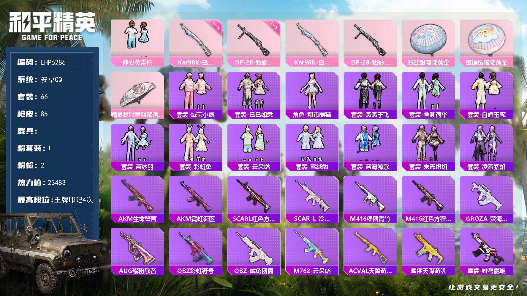 [13880160]可二次【店主推荐捡漏号!可直接换绑】 安卓 手Q-1粉装-2特效枪-2.3w热力值-4王牌印记-66套装-85枪皮【粉色套装】:粉装-仲夏莫吉托【粉色枪皮等级】:Kar98K-巳巳如意(五级),DP-28-豹影疾电(五级)