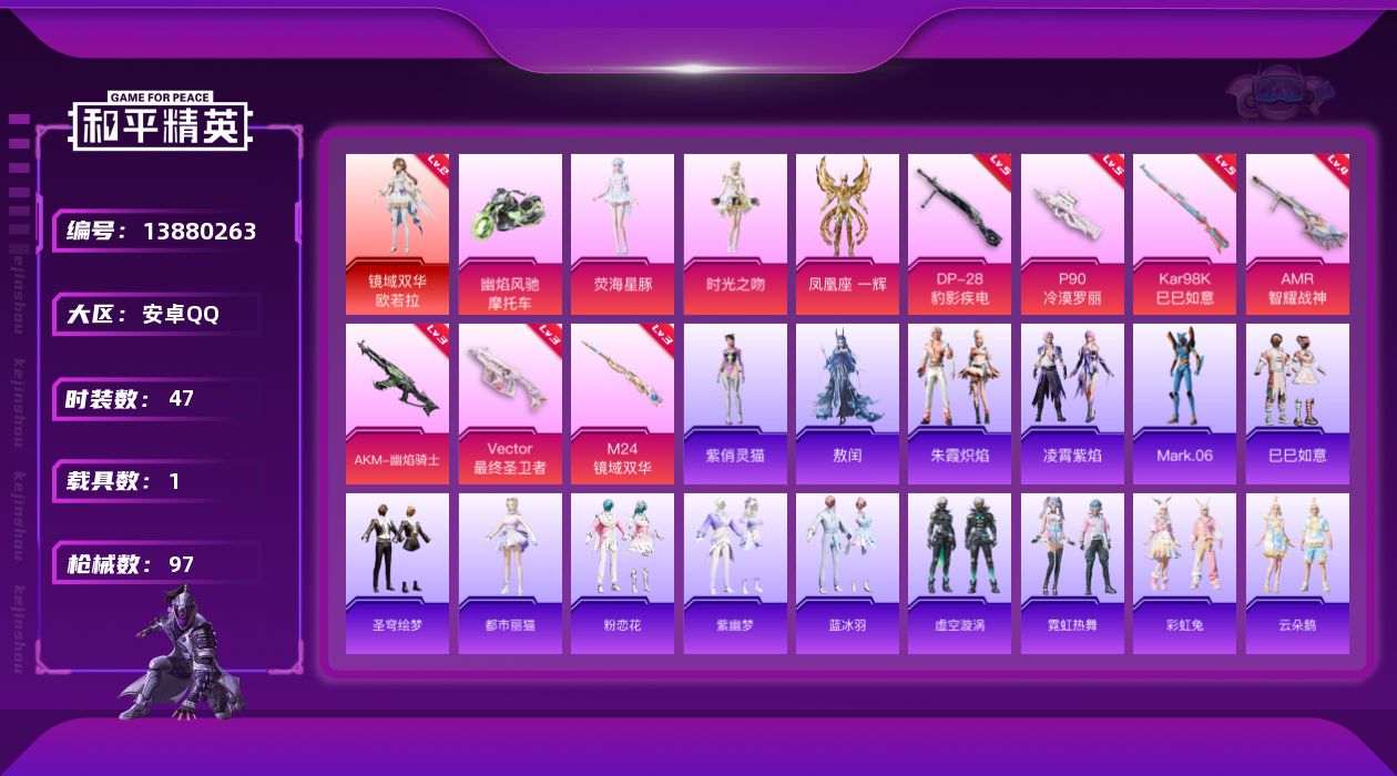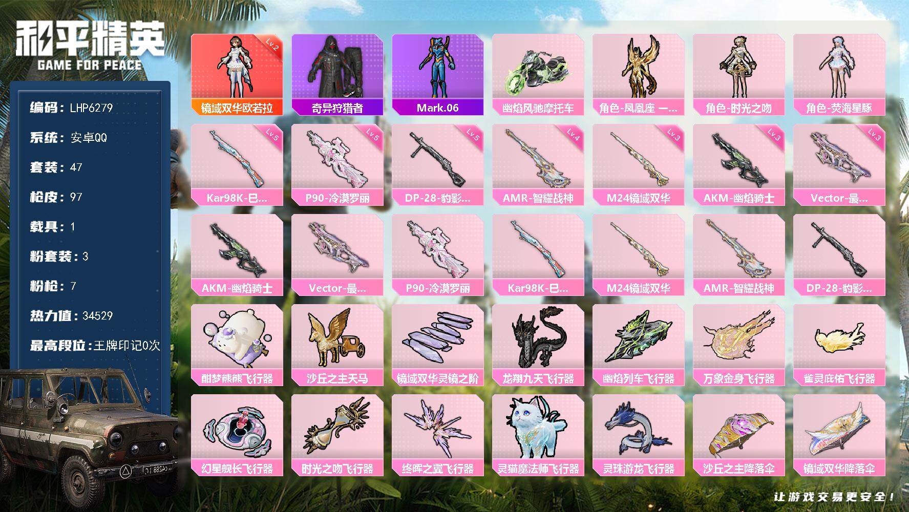 [13880263]【店主推荐捡漏号!可直接换绑】/素材身法号/地铁满天赋 安卓 手Q-1神装-3粉装-7特效枪-1载具-13粉色飞行器-3.4w热力值-1王牌印记-47套装-97枪皮【红色神装等级】:镜域双华-欧若拉(二级)【热门品类】:套装-奇异狩猎者,角色-Mark.06【粉色载具】:幽焰风驰摩托车【粉色套装】:角色-凤凰座 一辉,角色-时光之吻,角色-荧海星豚【粉色枪皮等级】:AKM-幽焰骑士(三级),Vector-最终圣卫者(三级),P90-冷漠罗丽(五级),Kar98K-巳巳如意(五级),M24-镜域双华(三级),AMR-智耀战神(四级),DP-28-豹影疾电(五级)【粉色飞行器】:酣梦熊熊飞行器,沙丘之主天马,镜域双华-灵镜之阶,龙翔九天飞行器,幽焰列车飞行器,万象金身飞行器,雀灵庇佑飞行器,幻星舰长飞行器,时光之吻飞行器,终晖之翼飞行器,灵猫魔法师飞行器,灵珠游龙飞行器