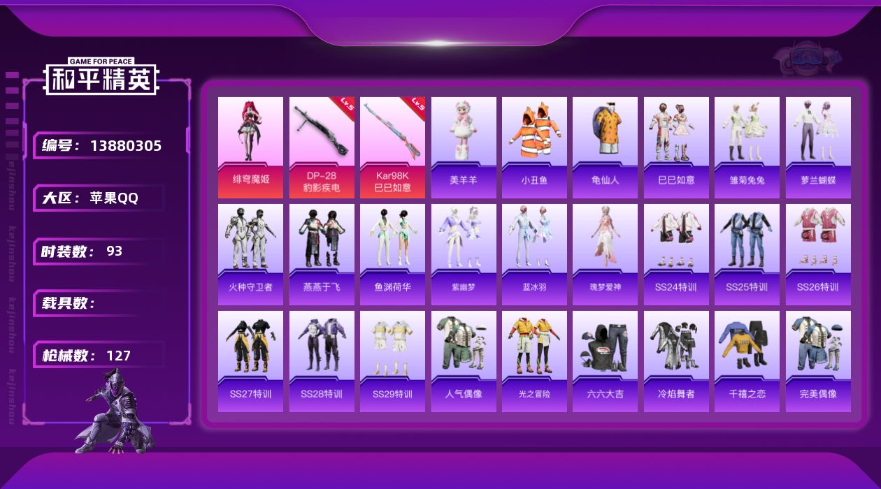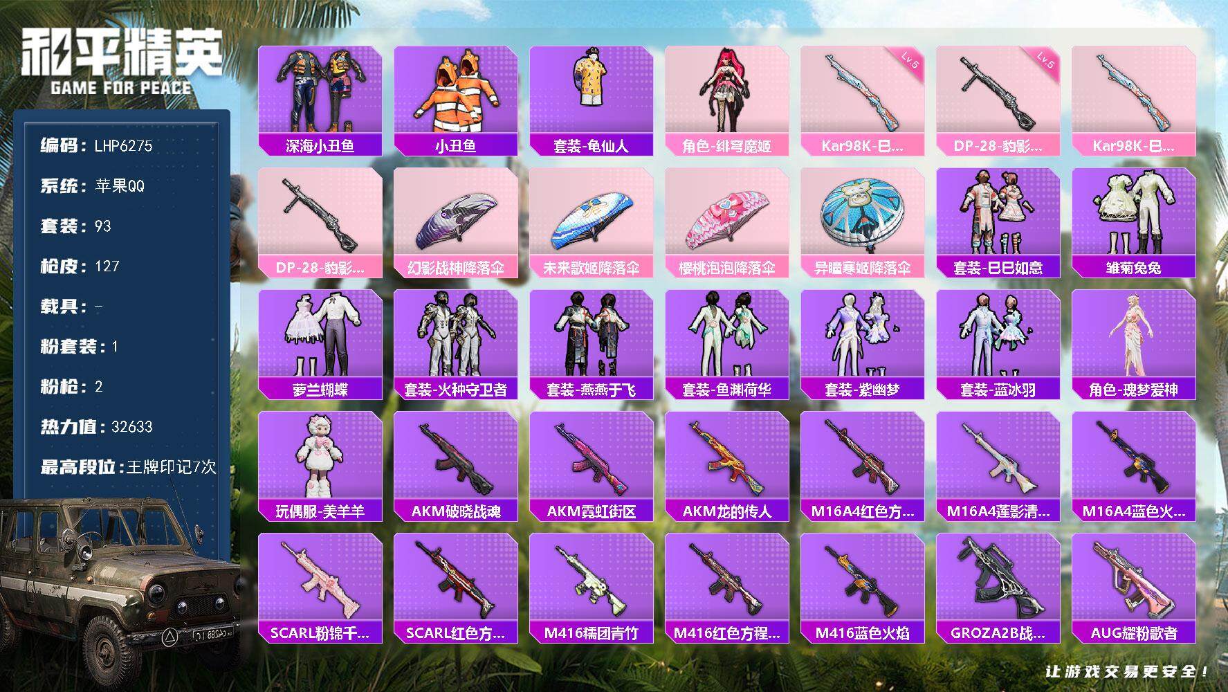 [13880305]【店主推荐捡漏号!可直接换绑】 苹果 手Q-1粉装-2特效枪-3.2w热力值-7王牌印记-93套装-127枪皮【热门品类】:套装-深海小丑鱼,套装-小丑鱼,套装-龟仙人【粉色套装】:角色-绯穹魔姬【粉色枪皮等级】:Kar98K-巳巳如意(五级),DP-28-豹影疾电(五级)