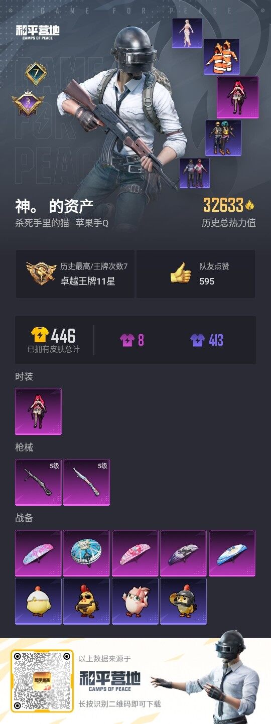 - PX_2066256- 安卓手Q-6王牌印记-5粉装-3特效枪-2载具-46447热力值-125套装-119枪皮-0卓越印记-0传奇印记 【5粉装】,雪国幻梦,梦幻火箭,金曜白虎,守护骑士,银河战甲 【3特效枪】M416-五爪金龙-7级 Kar98K-巳巳如意-4级 UMP45-雪国精灵-7级 【3稀有紫装】,奇异狩猎者,雪山精英,浪漫波比, 【2稀有载具】,玛莎拉蒂Ghibli(粉),玛莎拉蒂