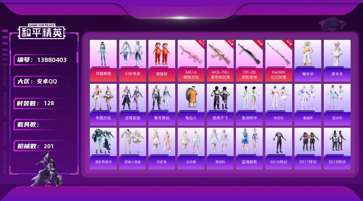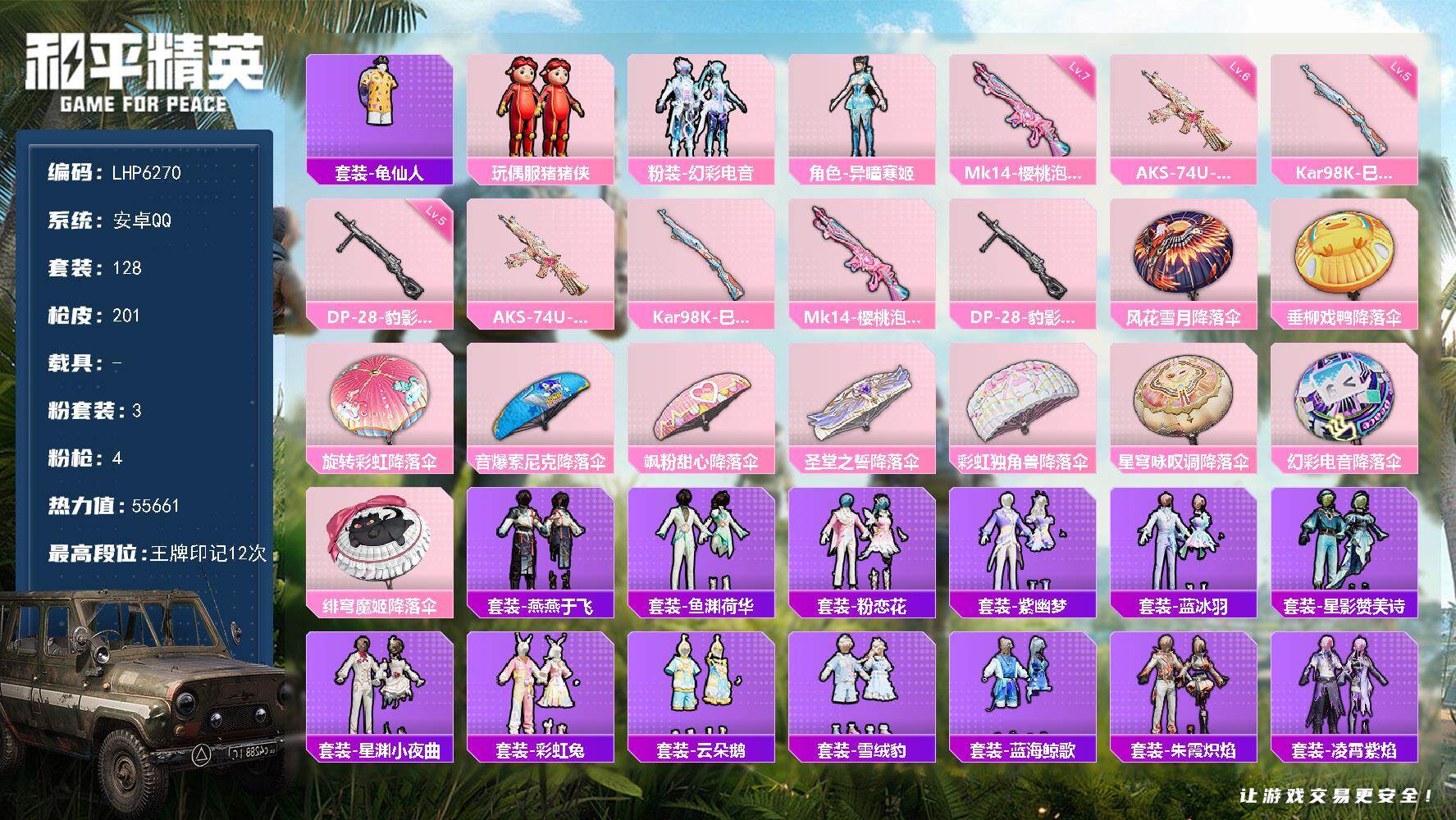 [13880403]【店主推荐捡漏号!可直接换绑】/地铁满天赋 安卓 手Q-3粉装-4特效枪-1粉色飞行器-5.5w热力值-12王牌印记-128套装-201枪皮【热门品类】:套装-龟仙人【粉色套装】:玩偶服-猪猪侠,粉装-幻彩电音,角色-异瞳寒姬【粉色枪皮等级】:AKS-74U-星穹咏叹调(六级),Kar98K-巳巳如意(五级),Mk14-樱桃泡泡(七级),DP-28-豹影疾电(五级)