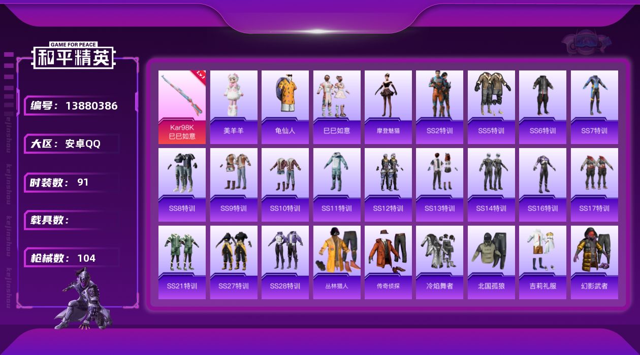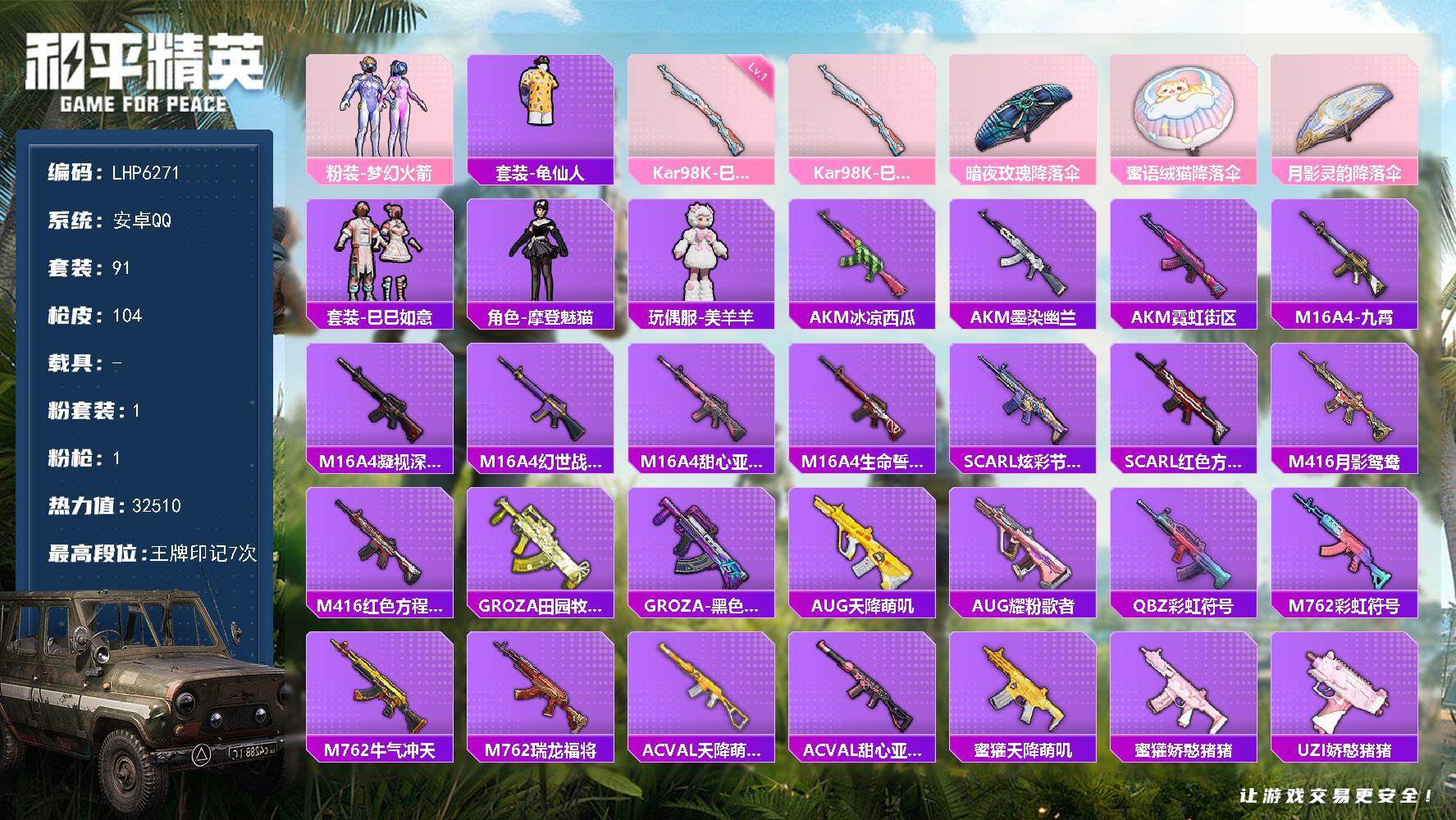 [13880386]【店主推荐捡漏号!可直接换绑】 安卓 手Q-1粉装-1特效枪-3.2w热力值-7王牌印记-91套装-104枪皮【热门品类】:粉装-梦幻火箭,套装-龟仙人【粉色套装】:粉装-梦幻火箭【粉色枪皮等级】:Kar98K-巳巳如意(一级)