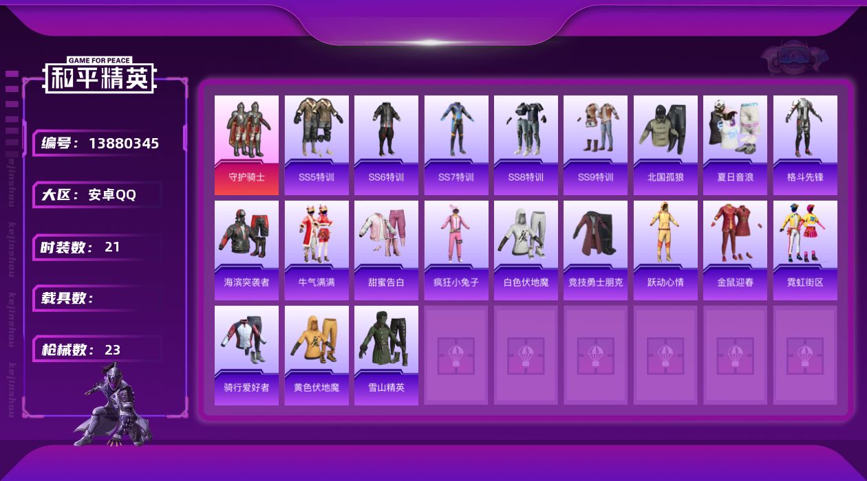- PX_2084949-实名: 可修改 时装数: 86 枪械数: 85 战备数: 68 热门装扮: 兔兔白日梦,暗夜鎏金 稀有枪皮: Kar98K-巳巳如意