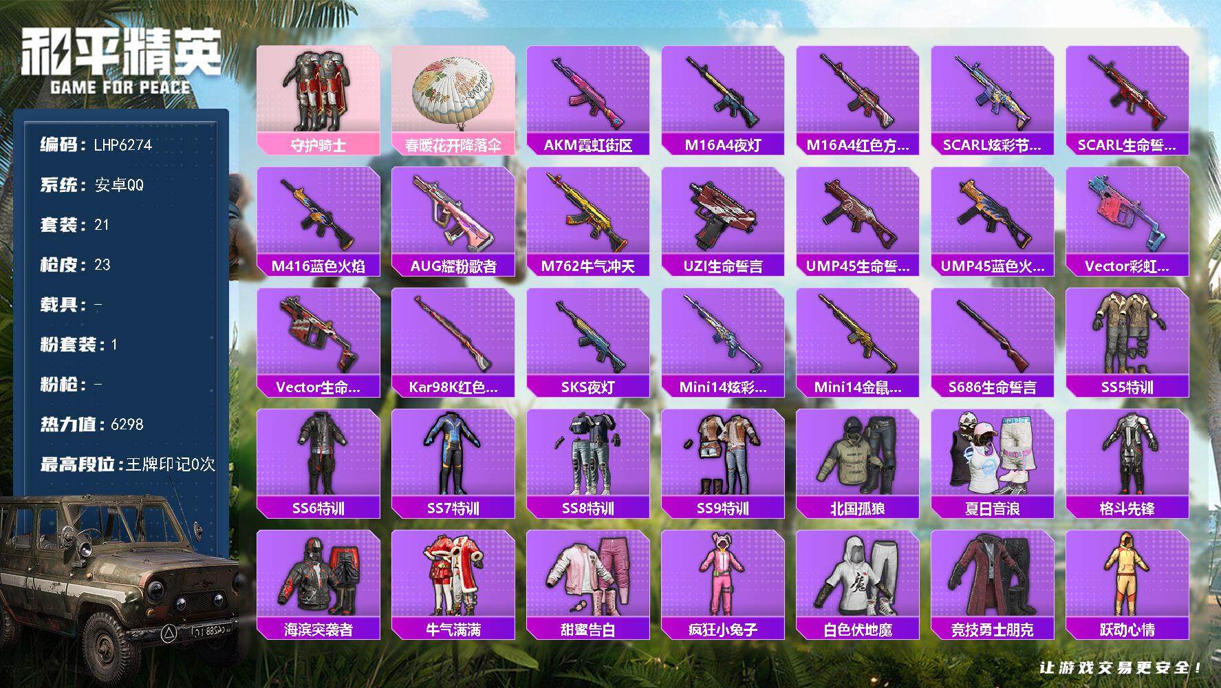 - [12946967]【暑期末清货/特价急出/永久包赔】:安卓 手Q-5粉装-4特效枪-2载具-4.3w热力值-7印记-88套装-154枪皮【稀有载具】:路特斯EVIJA(星际黄),路特斯ELETRE(冰川蓝)【特效枪等级】:SCAR-L-锦绣绵绵(五级),Vector-环太平洋(七级),Kar98K-巳巳如意(五级),DP-28-豹影疾电(五级)【优质套装】:角色-洛天依,粉装-星夜魔法师,角色-大黄蜂,角色-圣堂之誓,角色-樱桃泡泡【优质飞行器】:星夜魔法师飞行翼,拂晓神骑飞行器