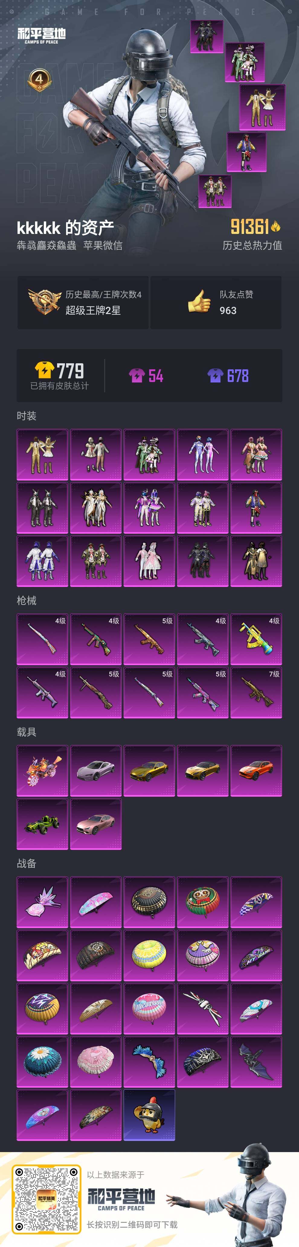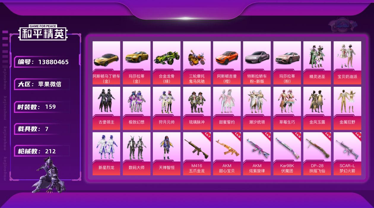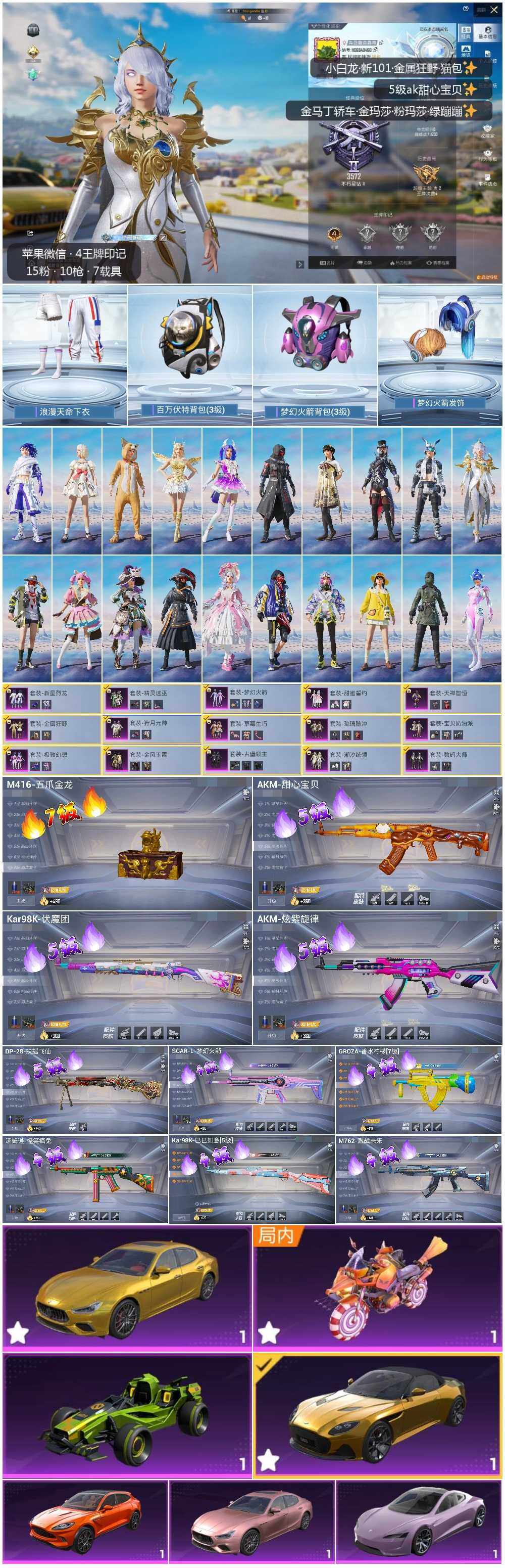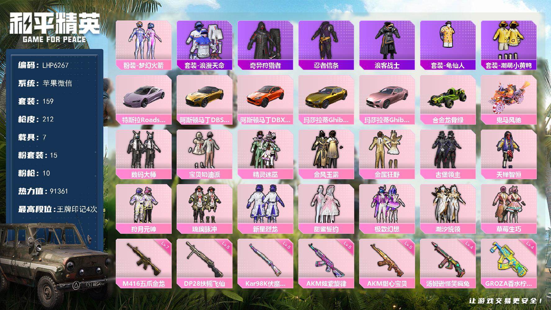 [13880465]可二次【店主推荐捡漏号!可直接换绑】 苹果 微信-15粉装-10特效枪-7载具-4粉色飞行器-9.1w热力值-4王牌印记-159套装-212枪皮【热门品类】:粉装-梦幻火箭,套装-浪漫天命,套装-奇异狩猎者,套装-忍者信条,套装-浪客战士,套装-龟仙人,套装-潮萌小黄鸭【粉色载具】:特斯拉Roadster(沁心粉),阿斯顿马丁DBS(金),阿斯顿马丁DBX(橙),玛莎拉蒂Ghibli(金),玛莎拉蒂Ghibli(粉),合金龙骨(绿),鬼马风驰【粉色套装】:粉装-数码大师,粉装-宝贝奶油派,粉装-精灵迷巫,粉装-梦幻火箭,粉装-金风玉露,粉装-金属狂野,粉装-古堡领主,粉装-天禅智恒,粉装-狩月元帅,粉装-琉璃脉冲,粉装-新星烈龙,粉装-甜蜜誓约,粉装-极致幻想,粉装-潮汐统领,粉装-草莓生巧【粉色枪皮等级】:AKM-甜心宝贝(五级),AKM-炫紫旋律(五级),SCAR-L-梦幻火箭(四级),M416-五爪金龙(七级),GROZA-香水柠檬(四级),M762-激战未来(四级),汤姆逊-怪笑疯兔(四级),Kar98K-伏魔团(五级),Kar98K-巳巳如意(四级),DP-28-扶摇飞仙(五级)【粉色飞行器】:古堡领主飞行器,四圣焕新飞行器