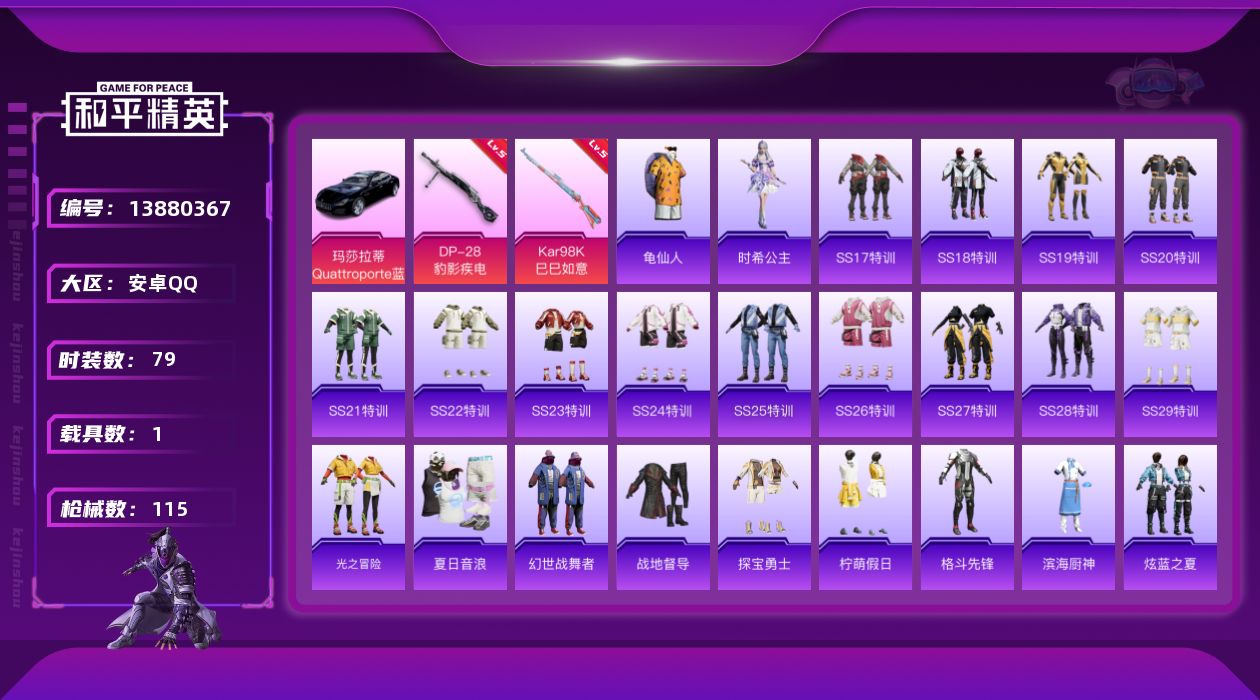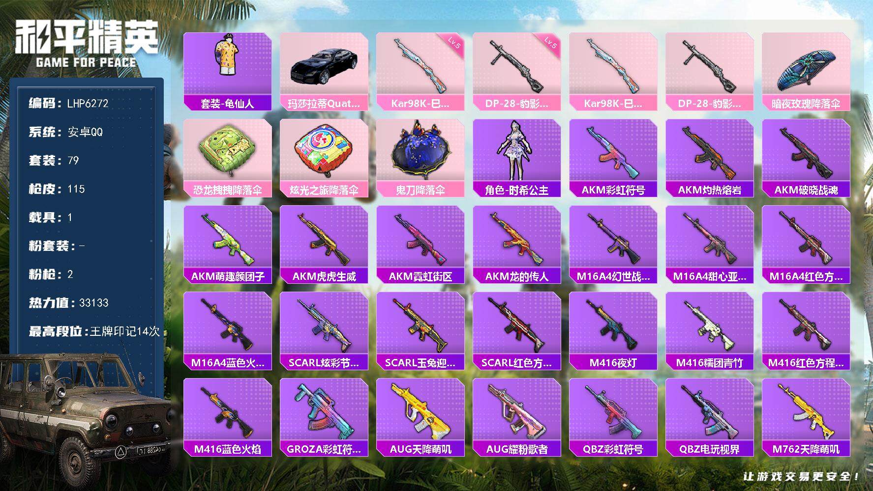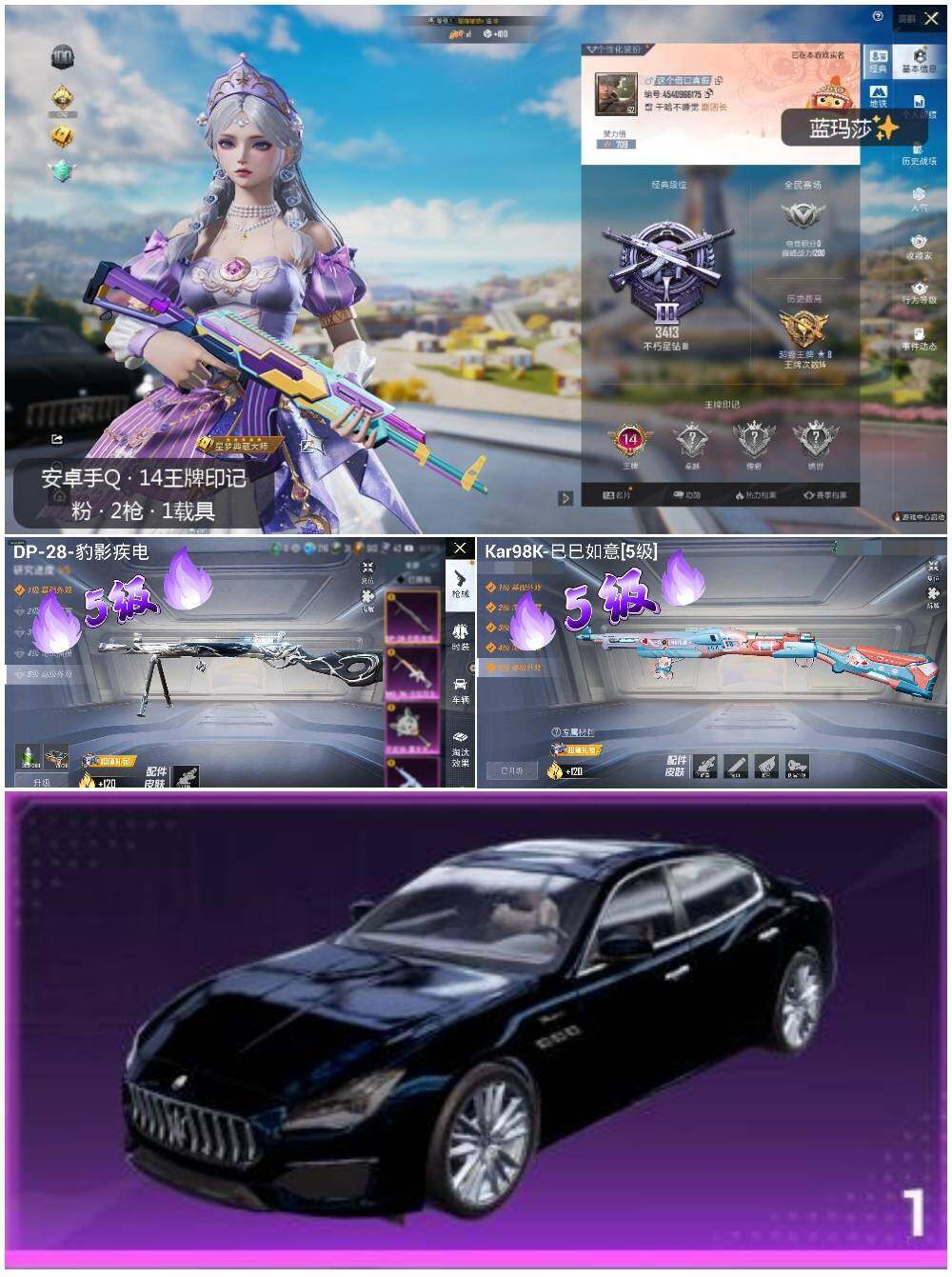[13880367]可二次【店主推荐捡漏号!可直接换绑】 安卓 手Q-2特效枪-1载具-1粉色飞行器-3.3w热力值-14王牌印记-79套装-115枪皮【热门品类】:套装-龟仙人【粉色载具】:玛莎拉蒂Quattroporte(夜幕蓝)【粉色枪皮等级】:Kar98K-巳巳如意(五级),DP-28-豹影疾电(五级)