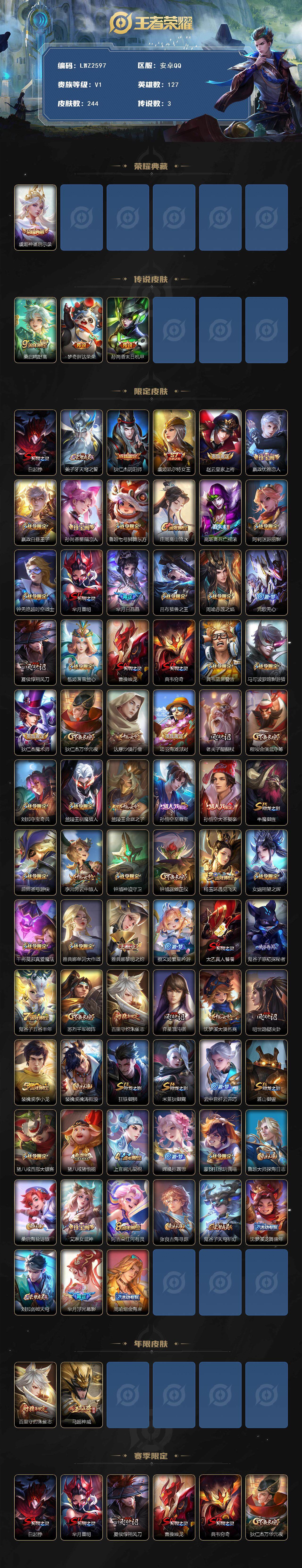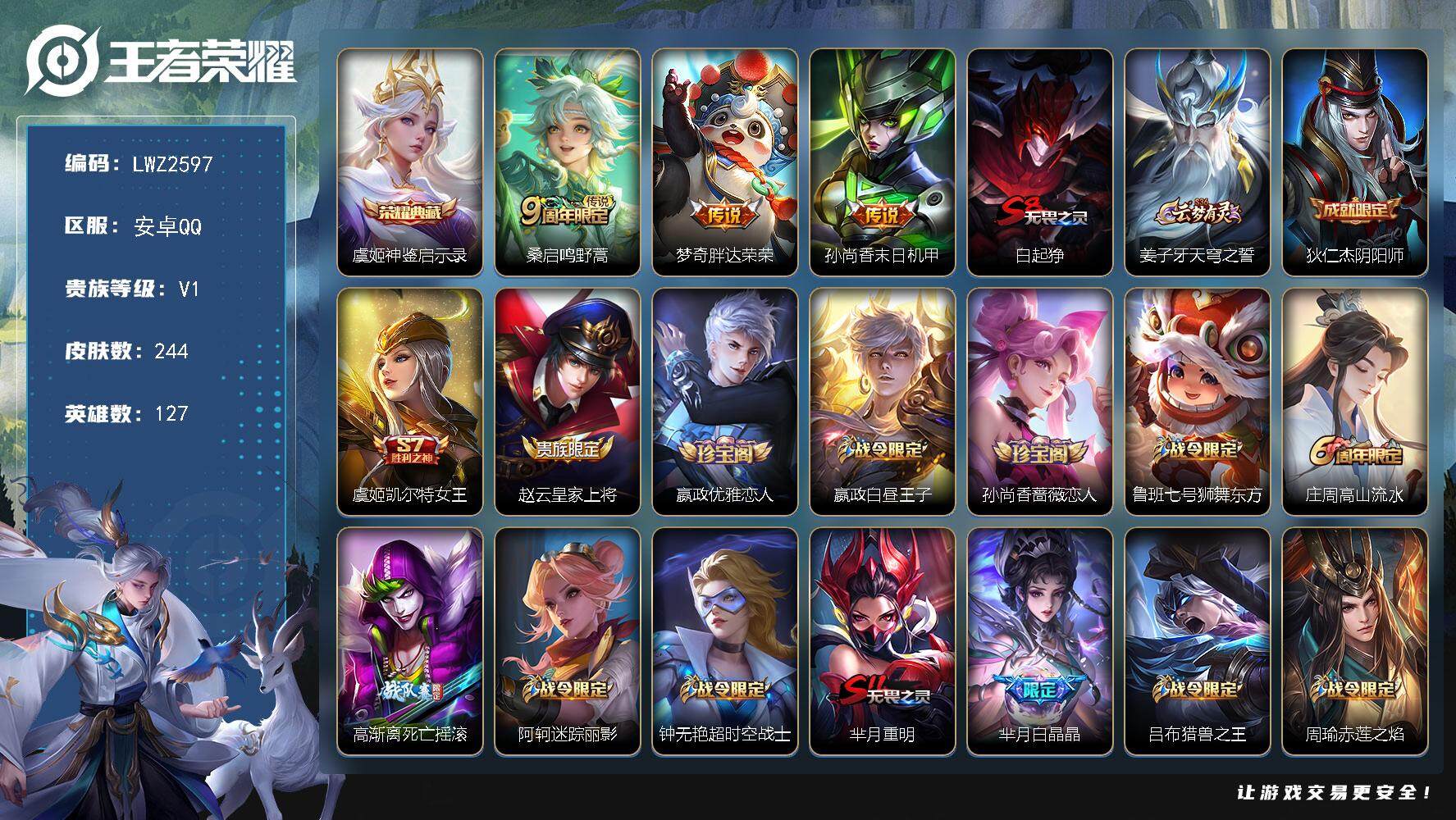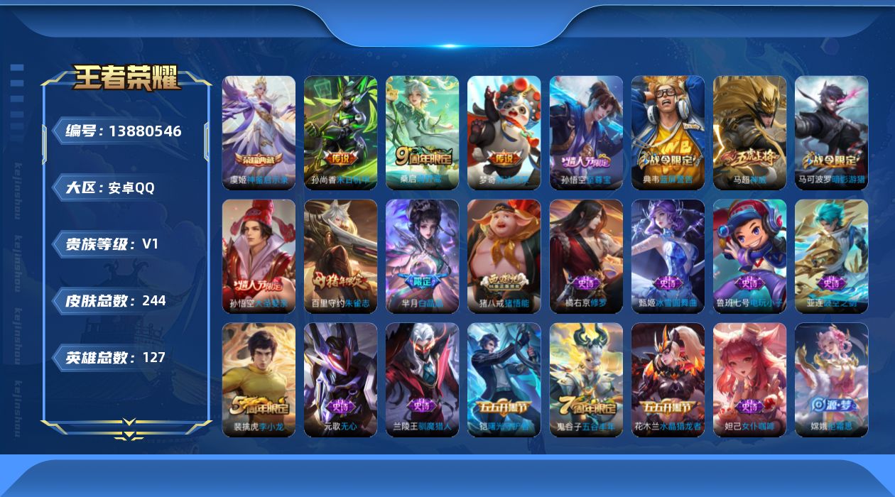 [13880546]安卓Q-V1-至尊星耀II段位-127英雄-244皮肤-1典藏-3传说-68史诗