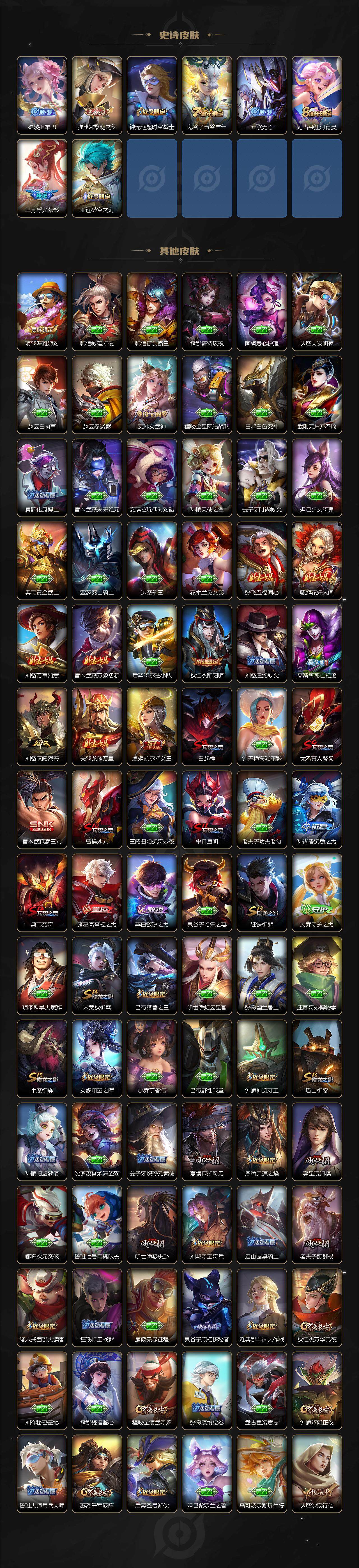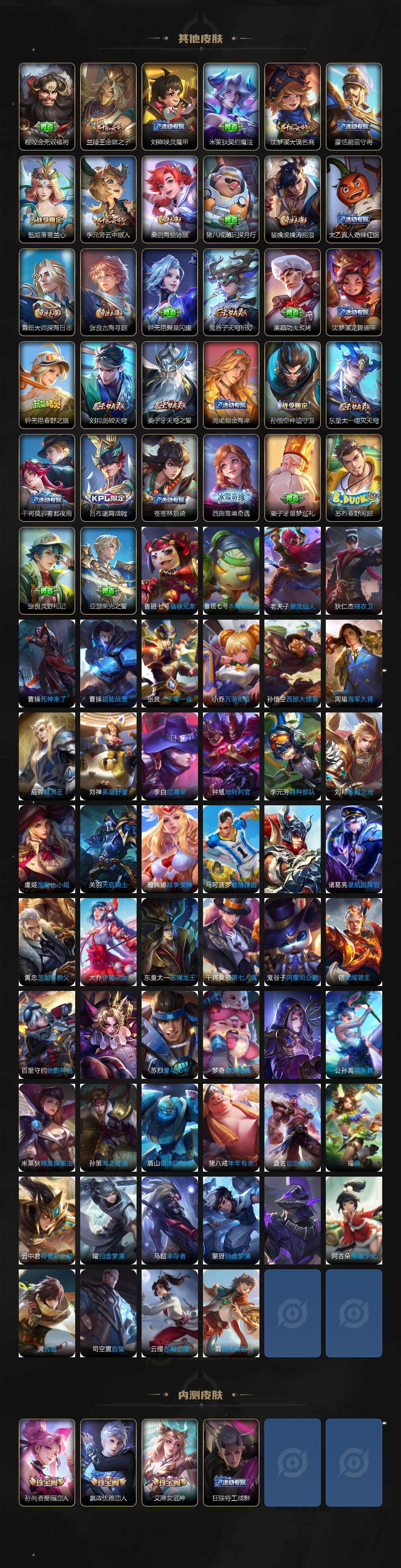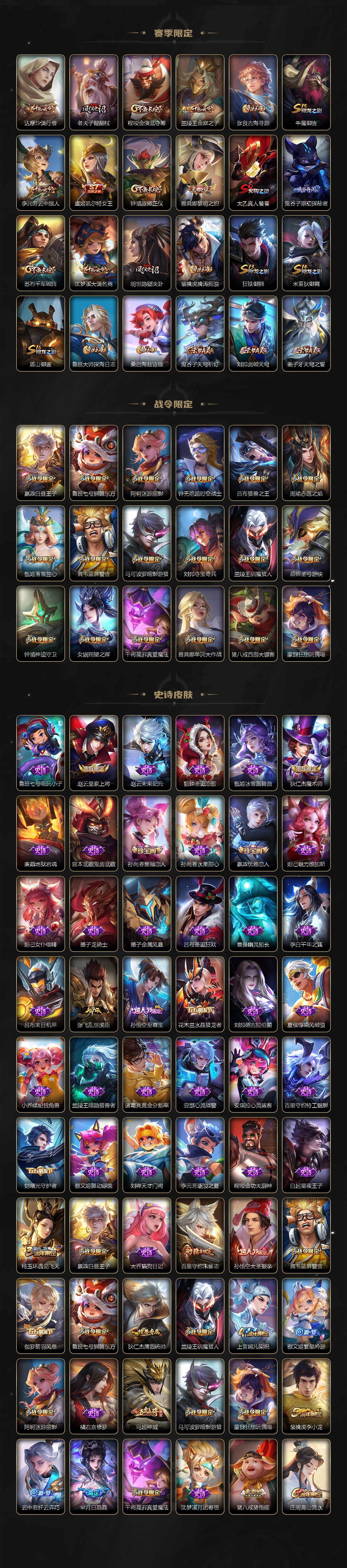【限定皮肤】:白起狰,姜子牙天穹之誓,狄仁杰阴阳师,虞姬凯尔特女王,赵云皇家上将,嬴政优雅恋人,嬴政白昼王子,孙尚香蔷薇恋人,鲁班七号狮舞东方,庄周高山流水,高渐离死亡摇滚,阿轲迷踪丽影,钟无艳超时空战士,芈月重明,芈月白晶晶,吕布猎兽之王,周瑜赤莲之焰,元歌无心,夏侯惇朔风刀,甄姬落雪兰心,曹操烛龙,典韦穷奇,典韦蓝屏警告,马可波罗暗影游猎,狄仁杰魔术师,狄仁杰万华元夜,达摩沙漠行僧,项羽海滩派对,老夫子醍醐杖,程咬金演武夺筹,刘邦夺宝奇兵,兰陵王驯魔猎人,兰陵王金庭之子,孙悟空至尊宝,孙悟空大圣娶亲,牛魔御旌,后羿圣弓游侠,李元芳云中旅人,钟馗神迹守卫,钟馗驱傩正仪,杨玉环遇见飞天,女娲朔望之晖,干将莫邪真爱魔法,雅典娜单词大作战,雅典娜黎明之约,蔡文姬繁星吟游,太乙真人饕餮,鬼谷子原初探秘者,鬼谷子五谷丰年,苏烈千军破阵,百里守约朱雀志,弈星混沌棋,沈梦溪大漠名商,明世隐疑决卦,裴擒虎李小龙,裴擒虎擒涛扼浪,狂铁御狮,米莱狄御霄,云中君纤云弄巧,盾山御銮,猪八戒西部大镖客,猪八戒猪悟能,上官婉儿梁祝,嫦娥拒霜思,蒙犽狂想玩偶喵,鲁班大师探海日志,桑启海盐诗旅,艾琳女武神,阿古朵江河有灵,张良古海寻踪,鬼谷子天穹祈灯,沈梦溪龙舞盛年,刘邦剑破天穹,芈月浮光幕影,周瑜熔金海岸