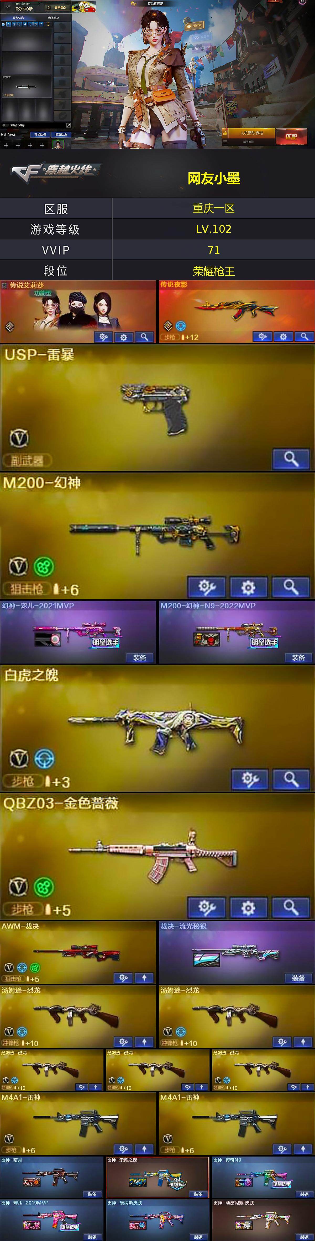 [13880625]重庆一区-62V-9王者-1炫金 【传说武器】:传说夜影 【传说角色】:传说艾莉莎 【热门武器】:传说夜影,QBZ03-金色蔷薇,M200-幻神,M4A1-黑骑士,汤姆逊-烈龙*5,斯泰尔-蝴蝶,USP-雷暴,沙鹰-修罗*5,金刚伞 【王者炫金武器】:王者之圣,炫金骑士 【音效卡】:M4A1-黑龙音效卡,Barrett-毁灭音效卡 【皮肤】:幻神-宠儿-2021MVP,M200-幻神-N9-2022MVP,裁决-流光秘银,雷神-暗月,雷神-荣耀之魄,雷神-传奇N9,雷神-宠儿-2019MVP,雷神-维纳斯皮肤,雷神-动感闪耀 皮肤,火麒麟-轻羽皮肤,火麒麟-百城,毁灭-CFS2020,M4A1-千变-孔明皮肤,黑龙-能量核心,烈火-熔核皮肤,战神-粉色甜心皮肤*2,战神-紫绶金章皮肤*2,战神-流金岁月皮肤,AK47-B-常胜将军-刘备,AK47-B-常胜将军-孙权,AWM-天龙-传奇白鲨,修罗-能量核心 【角色】:葵,王者春,王者-魅影,狐影,奇洋探员,乔伊教练,暗夜-X,飞虎队-X,嘉年华灵狐,灵狐-花神,灵狐者-七夕宝贝,潘多拉-X,潘多拉-甜心教官,蜀雪,铁骑荣耀,新娜塔莎,雪莉杨-摸金校尉,游珑儿 【人偶武器】:天龙-乔伊教练,斯泰尔-蝴蝶,加特林-机械猎手,AWM-灵狐-15周年嘉年华*2,迷你深渊冰龙,迷你牛魔王,迷你波特博士,闪光弹-小乔,巴雷特-赏金猎人 【挑战大师】:神圣爆裂者III,神圣爆裂者-末日III*2 【英雄级武器】:M4A1-千变,AK47-火麒麟,M4A1-黑龙,M4A1-雷神*2,M4A1-黑骑士,M4A1-死神,AK12-天启,AN94-超新星,AK47-雷暴,无影-神兵利器,黑武士-锦绣游龙,超新星-热带奇洋,M4A1-玫瑰精灵,QBZ03-金色蔷薇,烈火-动感闪耀,AK-47-猩红传说*2,AK47-B-战神,黑骑士-海王,白虎之魄-觉醒版,Barrett-毁灭,AWM-裁决,M200-幻神,汤姆逊-烈龙*5,沙鹰-修罗*5,USP-雷暴,天神-动感闪耀,屠龙,龙啸*3,擎天,麒麟刺,屠龙-动感闪耀,龙啸-热带奇洋,斩神刀-雷暴,王者之锋-觉醒版*2,王者之啸-觉醒版,王者之击-觉醒版,高爆手雷-雷暴*4,高爆手雷-竞技荣光,手雷-动感闪耀,高爆手雷-云龙,手雷-热带奇洋,闪光弹-雷暴*4,烟雾弹-雷暴*4,烟雾弹-云龙